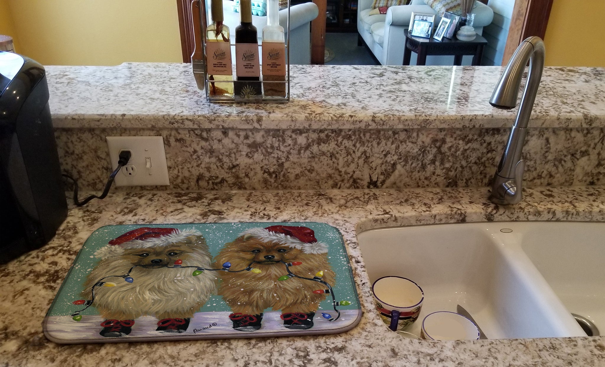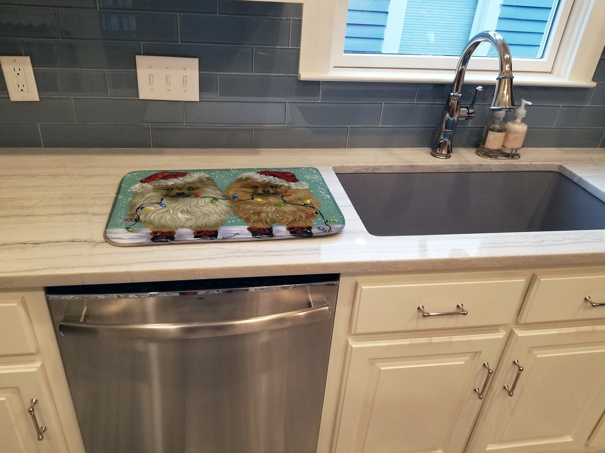 Decorate your space with our Christmas Pomeranian artwork on a Dish Drying Mat. Say goodbye to messy countertops and soggy dish towels with our innovative dish drying mat. Our high-quality dish drying pad is designed to keep your countertops dry while offering a stylish and efficient solution. Whether you're air drying dishes, glasses, stemware, silverware, pots, pans, bottles, or even fruits and vegetables, our dish mat is the perfect choice. The 14 inches x 22 inches size fits most counters and dish drying racks, and the non-slip design ensures stability. Made with water-absorbent polyester and a polyurethane foam insert, our dish drying mat is not only functional but also durable. It's machine washable and printed in the USA for long-lasting use. The beautiful artwork adds flair to your kitchen decor, making it a perfect housewarming gift or present for any occasion. Upgrade your kitchen experience with our absorbent and versatile dish drying mat.