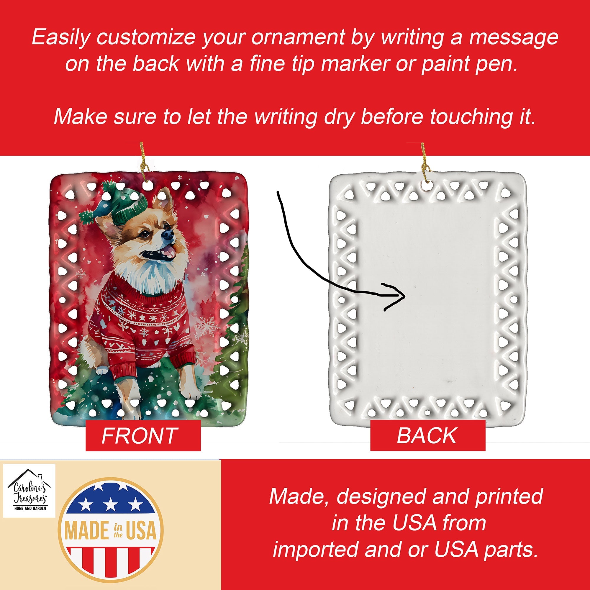 Porcelain Ornament featuring breed specific Pomeranian artwork. Celebrate Christmas with this Christmas Ornament. Add a unique, personal touch to your holiday decor with our Rectangular Lattice Porcelain Ornament. Perfect for creating cherished memories, this high-quality ornament shines under festive lights, reflecting warmth and joy throughout your Christmas tree. Crafted with a glossy finish, it showcases vibrant, full-color artwork contributed by our talented artists, ensuring your tree is adorned with a burst of color and holiday spirit. What sets this Porcelain Ornament apart is its customizable white back. Use a paint pen or permanent marker to write a heartfelt message, commemorate a special year, or mark an unforgettable date, turning this ornament into a keepsake that will be treasured for years to come. For best results, allow any personalization to dry thoroughly before handling. Each ornament comes complete with a delicate gold cord, making it easy to hang and display. Proudly made in the USA, this ornament measures 3.375 x 2.625 inches and is a thoughtful gift for pet sitters, teachers, family members, or anyone who would appreciate a little extra holiday magic. Bring style, charm, and a touch of personal meaning to your Christmas tree with this beautifully designed ornament..