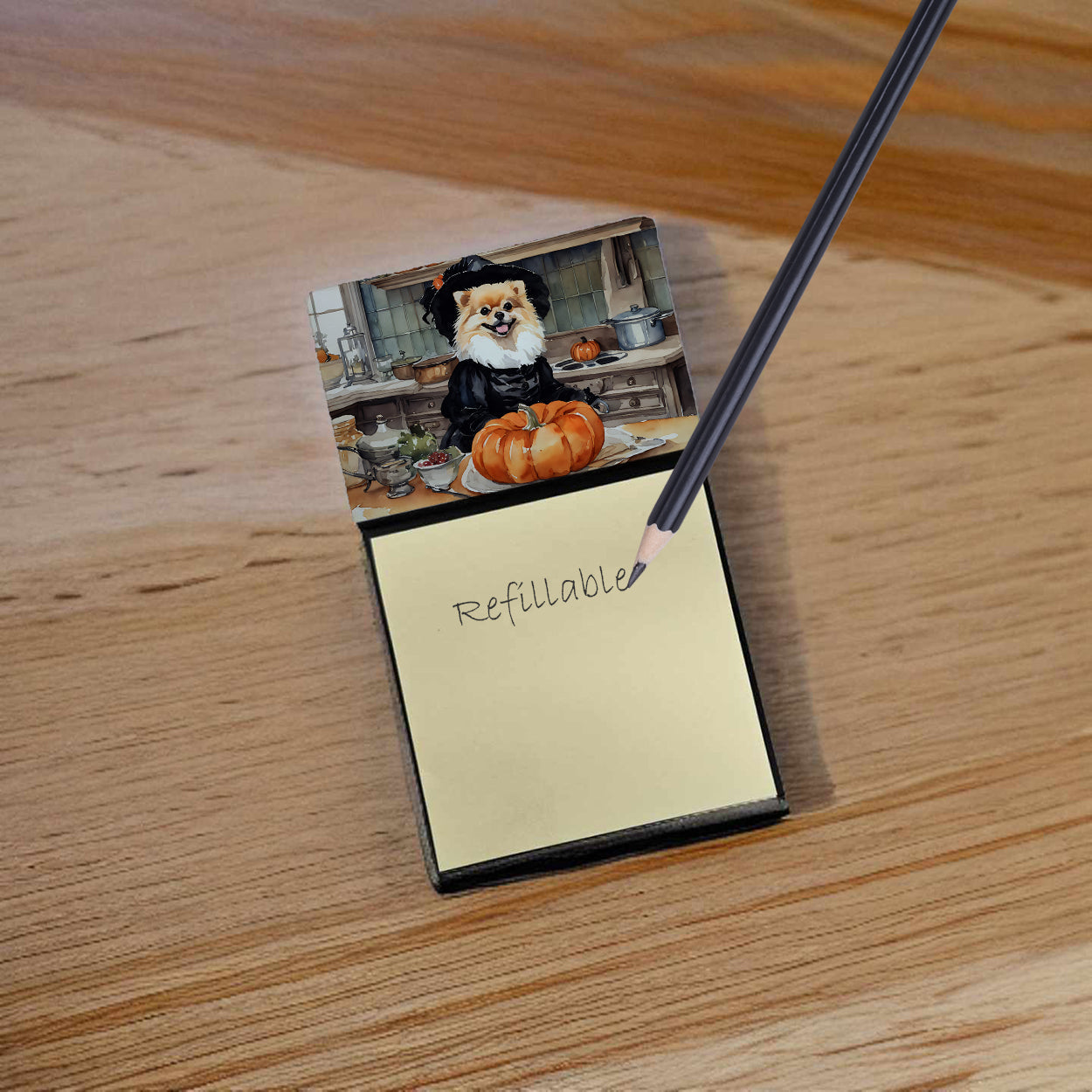 Pomeranian Fall Kitchen Pumpkins Sticky Note Holder- Refiilable Desk Accessory Note Pad