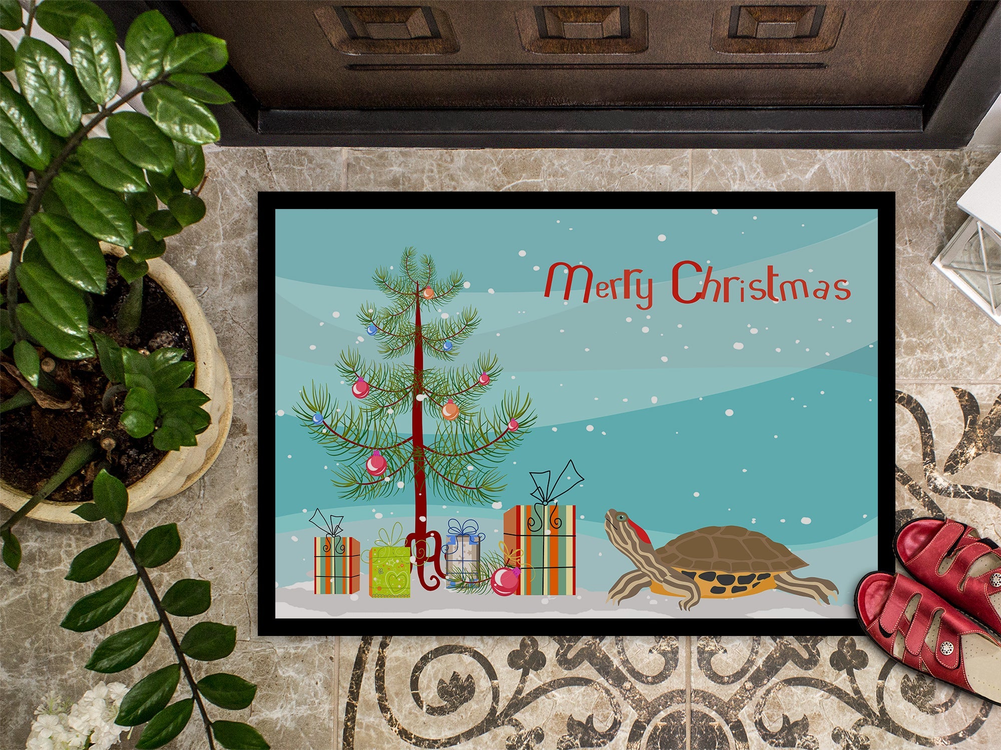 Decorate your space with our Christmas Pond Slider Turtle artwork on a Doormat. Welcome your guests in style with our Artwork Door Mat, designed to withstand almost any weather condition. This mat, measuring approximately 24 by 36 inches, is held together by durable black binding tape. Its top layer, composed of polyester felt, is dyed with the eye-catching image you see on the mat. A few layers below provide the mat with stability, while its rubber bottom is stamped to help prevent slipping and ensures safety. Our mat works wonderfully as both an indoor or outdoor door mat. For cleaning, simply hose it off with water or use a power washer - no need for any cleaner that produces suds. Avoid scrubbing with a brush, instead, opt for the vacuum on floor setting. Designed manufactured and printed in the USA, this mat is a perfect addition to your porch, outdoor kitchen, entryway, or any indoor space. Its unique design makes it a charming decorative rug that greets your guests and adds a stylish touch to your home decor.