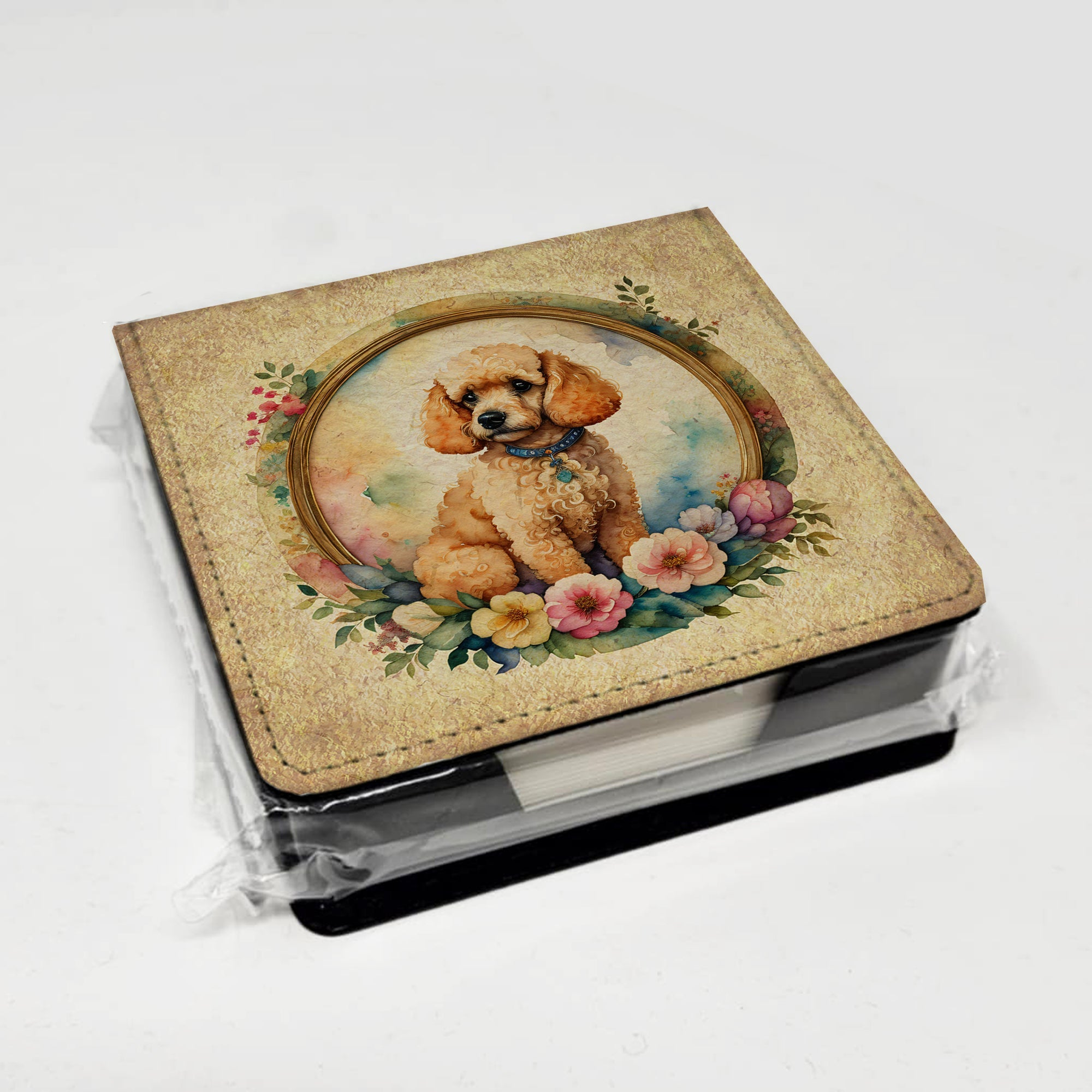 PU Leather Note Paper Holder featuring breed specific Poodle artwork. Elevate your workspace with this PU Leather Note Paper Holder, crafted to resemble luxurious leather without the use of animal products. Made from durable synthetic PU leather, it offers both a premium look and eco-friendly appeal. This note holder, compactly sized at 4.25 x 4.25 x 1.25 inches, includes about 160 sheets of 3.75 x 3.75-inch note paper—ideal for quick notes and reminders. An exclusive artist-designed cover makes each holder uniquely vibrant, adding a splash of color and personality to any desk or office. The discrete design keeps note paper hidden, maintaining a neat and organized workspace. Perfect as a gift or for personal use, this stylish holder is refillable with standard paper, ensuring long-lasting utility. A must-have for anyone seeking a sophisticated, artful touch to their workspace while supporting animal-friendly products. Add style, organization, and creativity to your everyday routine with this elegant note paper holder.