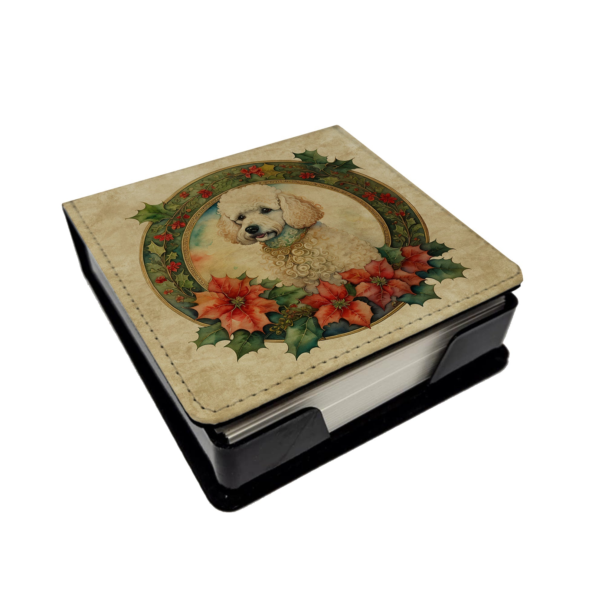 PU Leather Note Paper Holder featuring breed specific Poodle artwork. Celebrate Christmas with this Christmas Note Paper Holder. Elevate your workspace with this PU Leather Note Paper Holder, crafted to resemble luxurious leather without the use of animal products. Made from durable synthetic PU leather, it offers both a premium look and eco-friendly appeal. This note holder, compactly sized at 4.25 x 4.25 x 1.25 inches, includes about 160 sheets of 3.75 x 3.75-inch note paper—ideal for quick notes and reminders. An exclusive artist-designed cover makes each holder uniquely vibrant, adding a splash of color and personality to any desk or office. The discrete design keeps note paper hidden, maintaining a neat and organized workspace. Perfect as a gift or for personal use, this stylish holder is refillable with standard paper, ensuring long-lasting utility. A must-have for anyone seeking a sophisticated, artful touch to their workspace while supporting animal-friendly products. Add style, organization, and creativity to your everyday routine with this elegant note paper holder.