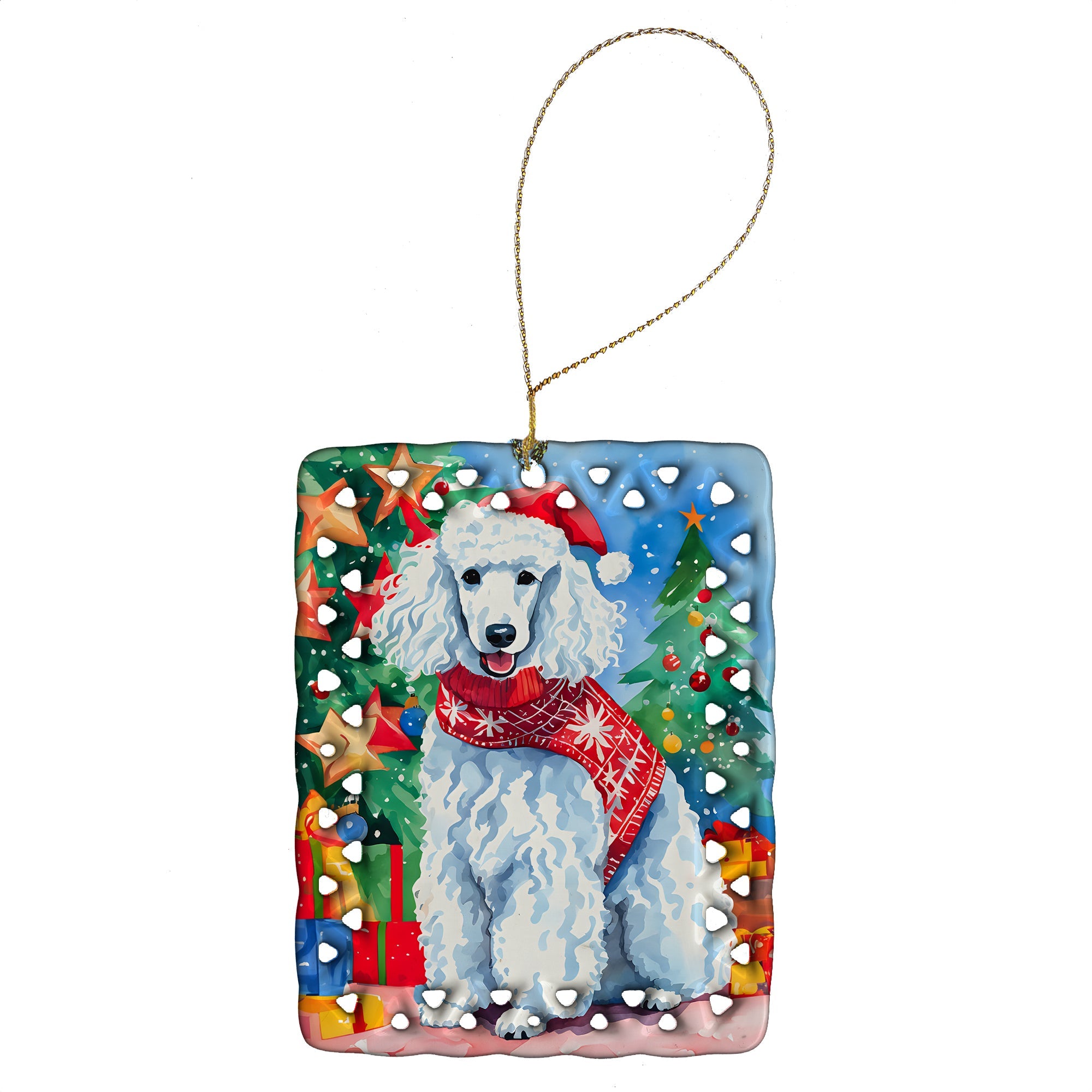 Porcelain Ornament featuring breed specific Poodle artwork. Celebrate Christmas with this Christmas Ornament. Add a unique, personal touch to your holiday decor with our Rectangular Lattice Porcelain Ornament. Perfect for creating cherished memories, this high-quality ornament shines under festive lights, reflecting warmth and joy throughout your Christmas tree. Crafted with a glossy finish, it showcases vibrant, full-color artwork contributed by our talented artists, ensuring your tree is adorned with a burst of color and holiday spirit. What sets this Porcelain Ornament apart is its customizable white back. Use a paint pen or permanent marker to write a heartfelt message, commemorate a special year, or mark an unforgettable date, turning this ornament into a keepsake that will be treasured for years to come. For best results, allow any personalization to dry thoroughly before handling. Each ornament comes complete with a delicate gold cord, making it easy to hang and display. Proudly made in the USA, this ornament measures 3.375 x 2.625 inches and is a thoughtful gift for pet sitters, teachers, family members, or anyone who would appreciate a little extra holiday magic. Bring style, charm, and a touch of personal meaning to your Christmas tree with this beautifully designed ornament..