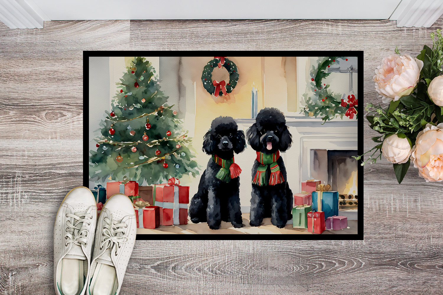 Decorate your space with our Christmas Poodle artwork on a Doormat. Welcome your guests in style with our Artwork Door Mat, designed to withstand almost any weather condition. This mat, measuring approximately 18 by 27 inches, is held together by durable black binding tape. Its top layer, composed of polyester felt, is dyed with the eye-catching image you see on the mat. A few layers below provide the mat with stability, while its rubber bottom is stamped to help prevent slipping and ensures safety. Our mat works wonderfully as both an indoor or outdoor door mat. For cleaning, simply hose it off with water or use a power washer - no need for any cleaner that produces suds. Avoid scrubbing with a brush, instead, opt for the vacuum on floor setting. Designed manufactured and printed in the USA, this mat is a perfect addition to your porch, outdoor kitchen, entryway, or any indoor space. Its unique design makes it a charming decorative rug that greets your guests and adds a stylish touch to your home decor.