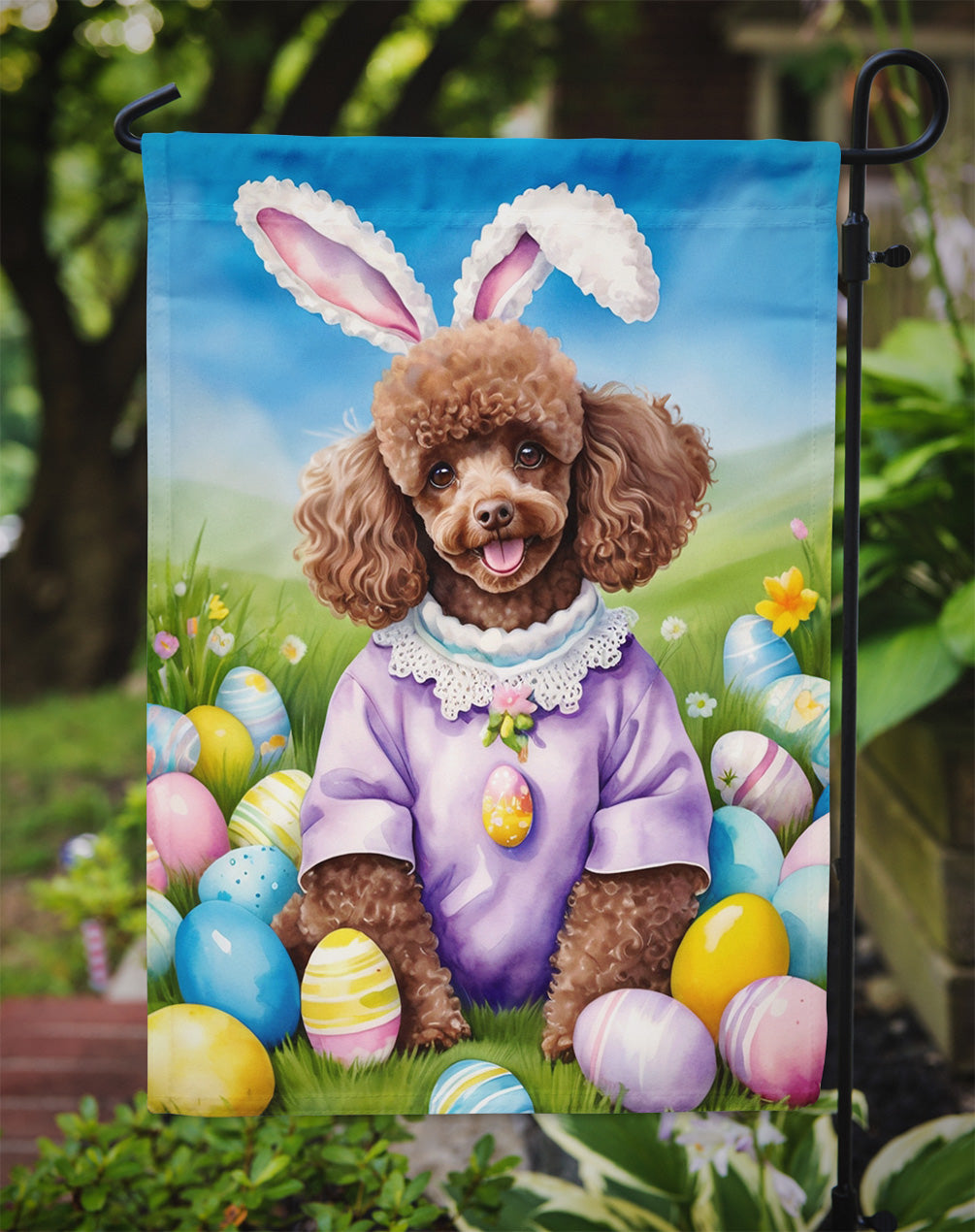 Decorate your space with our Easter Poodle artwork on a Garden Flag. Enhance the beauty of your garden, patio, or yard with Caroline's Treasures Decorative Garden Flag, proudly made in the USA. Crafted from two pieces of thick, double-sided polyester fabric, this 2-ply garden flag is designed to withstand various weather conditions, making it water-resistant and weatherproof. Featuring correctly readable words on both sides, this garden flag offers a delightful visual experience from any angle. With its heavier weight, it stands out among other garden flags, ensuring stability and durability even in wind, rain, and snow. Measuring approximately 11 1/4 inches by 15 1/2 inches, this flag allows you to personalize your outdoor decor. It comes with a 1 1/2-inch sleeve sewn in, allowing easy attachment to any standard garden flag stand or garden size porch hanger (sold separately). Make a statement in your outdoor space with Caroline's Treasures Decorative Garden Flag, a vibrant and high-quality flag that adds color and personality to your surroundings. Proudly made in the USA, it's a symbol of quality craftsmanship and attention to detail.
