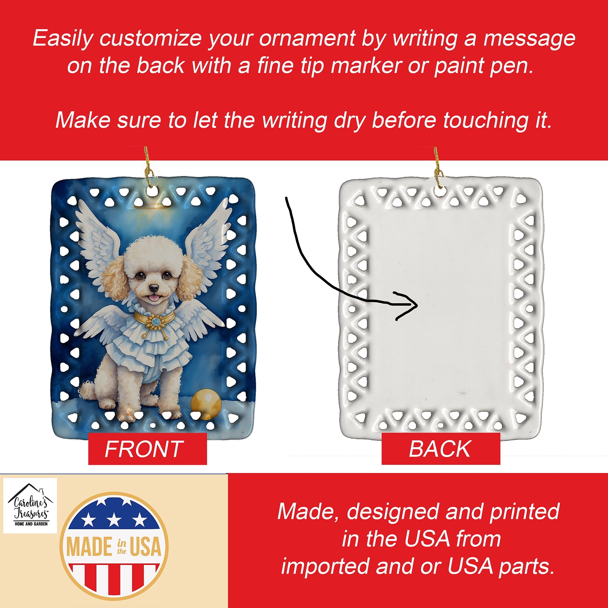 Porcelain Ornament featuring breed specific Poodle artwork. Celebrate Christmas with this Christmas Ornament. Add a unique, personal touch to your holiday decor with our Rectangular Lattice Porcelain Ornament. Perfect for creating cherished memories, this high-quality ornament shines under festive lights, reflecting warmth and joy throughout your Christmas tree. Crafted with a glossy finish, it showcases vibrant, full-color artwork contributed by our talented artists, ensuring your tree is adorned with a burst of color and holiday spirit. What sets this Porcelain Ornament apart is its customizable white back. Use a paint pen or permanent marker to write a heartfelt message, commemorate a special year, or mark an unforgettable date, turning this ornament into a keepsake that will be treasured for years to come. For best results, allow any personalization to dry thoroughly before handling. Each ornament comes complete with a delicate gold cord, making it easy to hang and display. Proudly made in the USA, this ornament measures 3.375 x 2.625 inches and is a thoughtful gift for pet sitters, teachers, family members, or anyone who would appreciate a little extra holiday magic. Bring style, charm, and a touch of personal meaning to your Christmas tree with this beautifully designed ornament..
