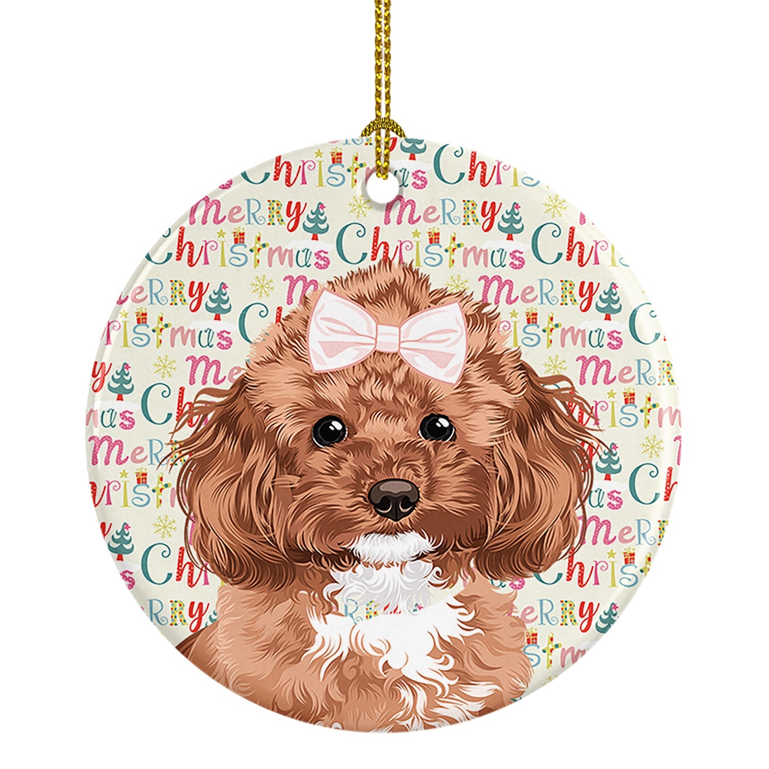 Decorate your space with our Christmas Poodle artwork on a Ornament. Add a touch of personalized charm to your Christmas tree this holiday season with our Ceramic Ornament. Measuring 2.8125 inches in diameter, this round porcelain ornament beautifully reflects your festive lights, enhancing your holiday decor. The gloss surface sets off the vibrant, full-color artwork contributed by one of our talented artists, bringing a pop of color and joy to your tree. This Ceramic Ornament doesn't stop at being merely decorative. The white back is designed for personalization. Write a heartfelt message, mark a special year, or inscribe a date with a paint pen or a permanent marker to create a treasured memento. Please ensure you allow any personalization to dry thoroughly before handling to maintain the pristine finish. Included with the ornament is a delicate gold cord for easy hanging. Made in the USA, this Ceramic Ornament makes an exceptional gift for a pet sitter, teacher, family member, or anyone you wish to share a little Christmas magic with. With its blend of style, charm, and personal touch, it's a meaningful addition to any Christmas tree.