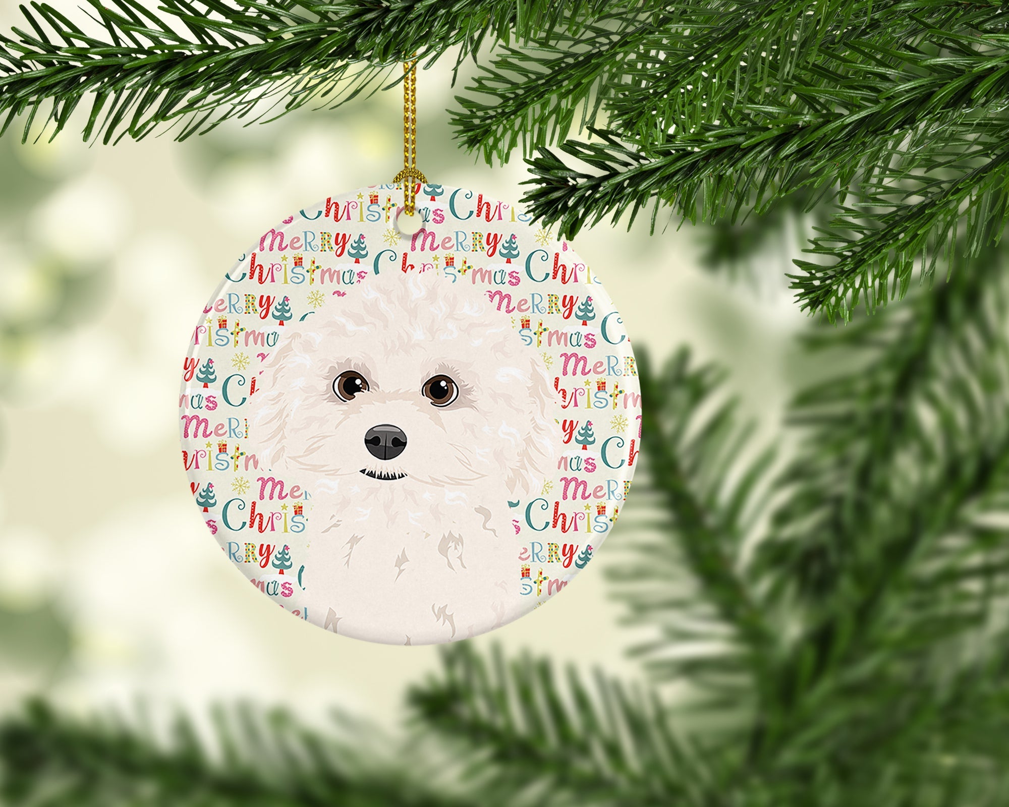 Decorate your space with our Christmas Poodle artwork on a Ornament. Add a touch of personalized charm to your Christmas tree this holiday season with our Ceramic Ornament. Measuring 2.8125 inches in diameter, this round porcelain ornament beautifully reflects your festive lights, enhancing your holiday decor. The gloss surface sets off the vibrant, full-color artwork contributed by one of our talented artists, bringing a pop of color and joy to your tree. This Ceramic Ornament doesn't stop at being merely decorative. The white back is designed for personalization. Write a heartfelt message, mark a special year, or inscribe a date with a paint pen or a permanent marker to create a treasured memento. Please ensure you allow any personalization to dry thoroughly before handling to maintain the pristine finish. Included with the ornament is a delicate gold cord for easy hanging. Made in the USA, this Ceramic Ornament makes an exceptional gift for a pet sitter, teacher, family member, or anyone you wish to share a little Christmas magic with. With its blend of style, charm, and personal touch, it's a meaningful addition to any Christmas tree.