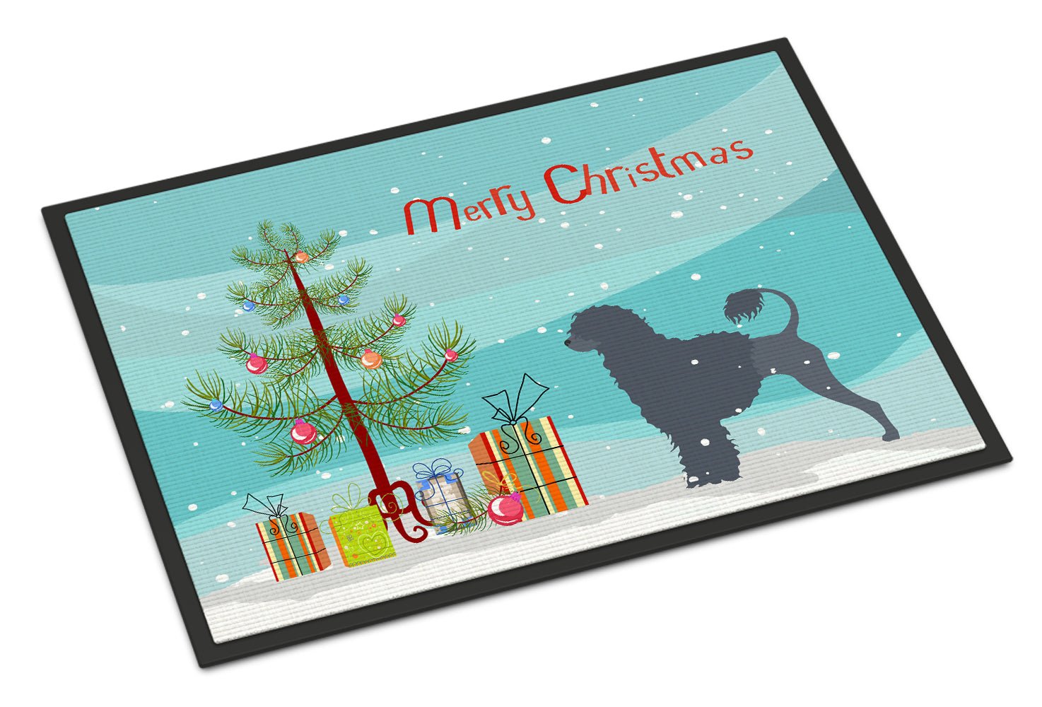 Decorate your space with our Christmas Portuguese Water Dog artwork on a Doormat. Welcome your guests in style with our Artwork Door Mat, designed to withstand almost any weather condition. This mat, measuring approximately 24 by 36 inches, is held together by durable black binding tape. Its top layer, composed of polyester felt, is dyed with the eye-catching image you see on the mat. A few layers below provide the mat with stability, while its rubber bottom is stamped to help prevent slipping and ensures safety. Our mat works wonderfully as both an indoor or outdoor door mat. For cleaning, simply hose it off with water or use a power washer - no need for any cleaner that produces suds. Avoid scrubbing with a brush, instead, opt for the vacuum on floor setting. Designed manufactured and printed in the USA, this mat is a perfect addition to your porch, outdoor kitchen, entryway, or any indoor space. Its unique design makes it a charming decorative rug that greets your guests and adds a stylish touch to your home decor.