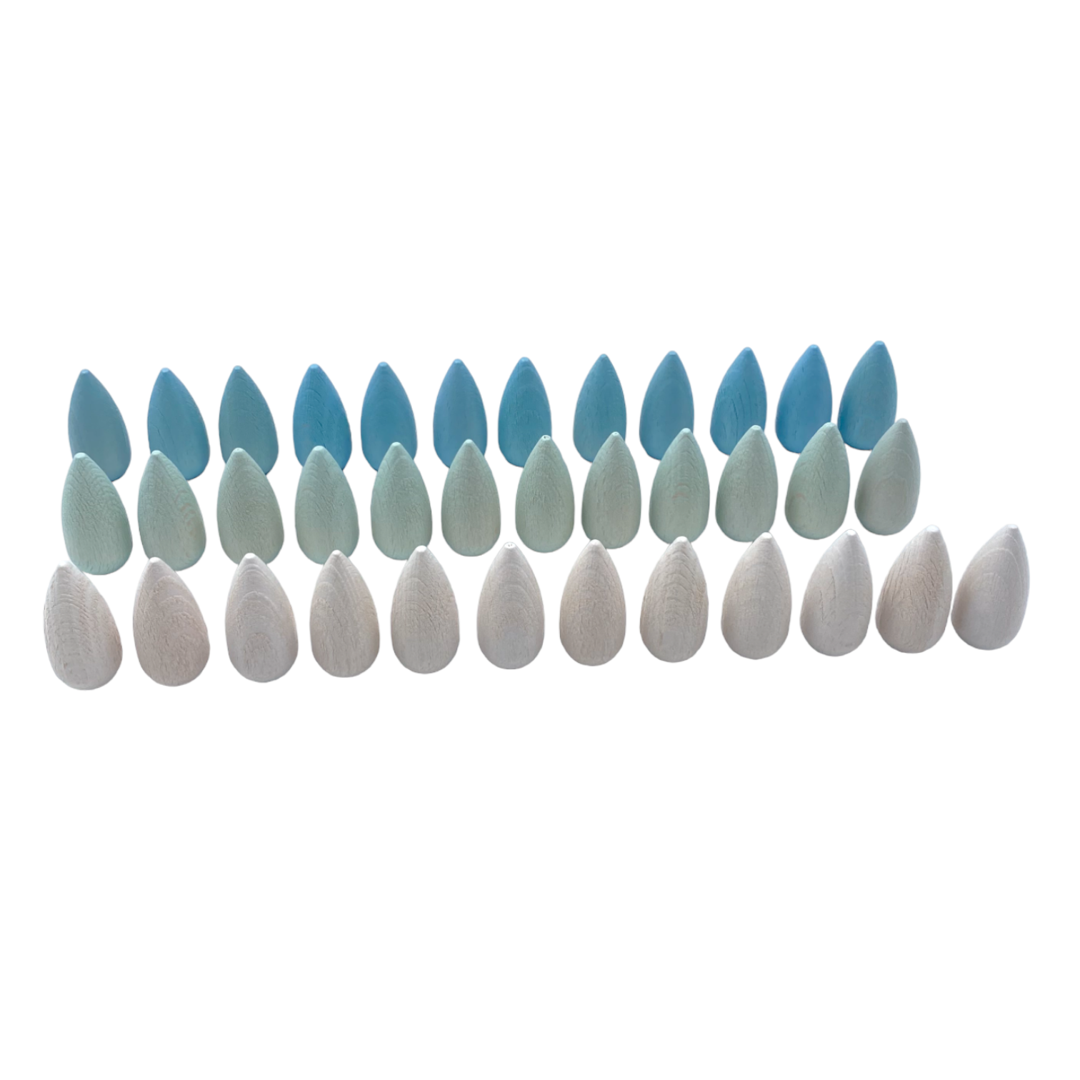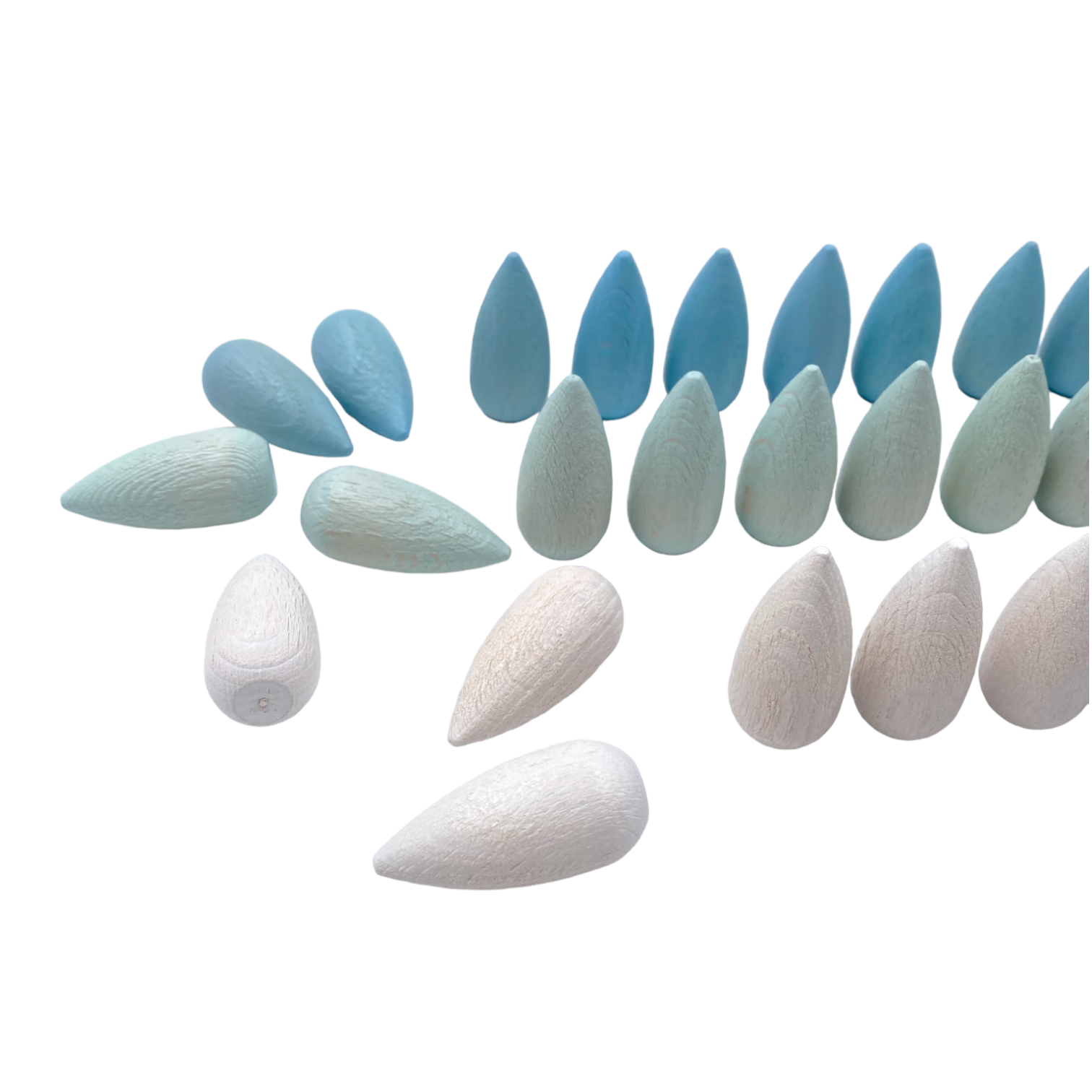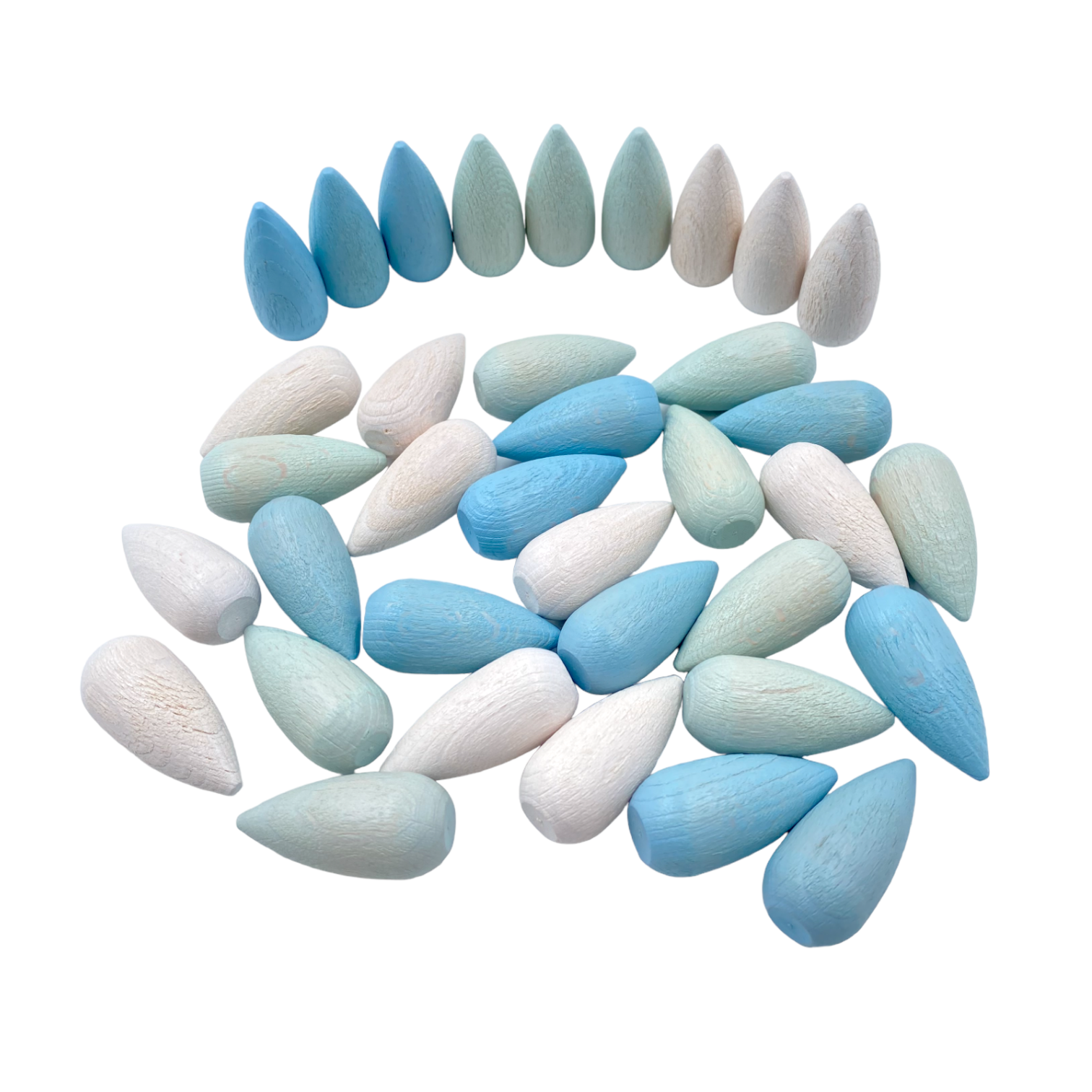 This set comes with 36 wooden mandala snowflakes in three shades of light blue to white. Lay them out in patterns independently, or mix them with the other loose parts for spectacular results and more intricate and beautiful designs.