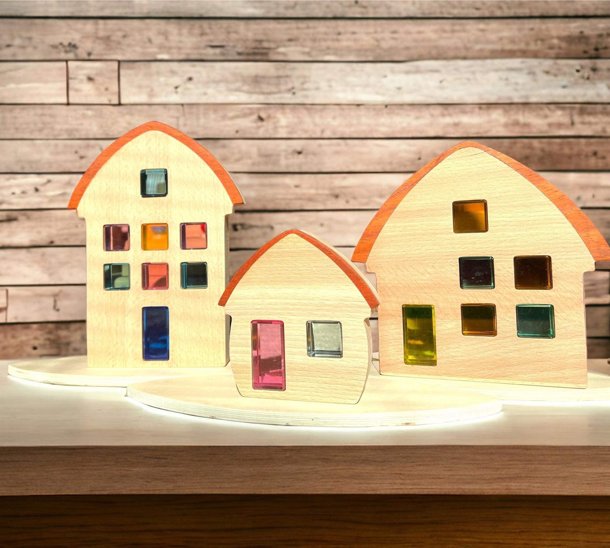 Bring your child’s building world to life with this charming set of three wooden window houses, designed to perfectly complement our lucite cube sets. Each house features beautifully carved window openings that can hold 3, 7, or 9 lucite cubes, allowing light to pass through and cast colorful reflections — creating a magical sensory and visual play experience.