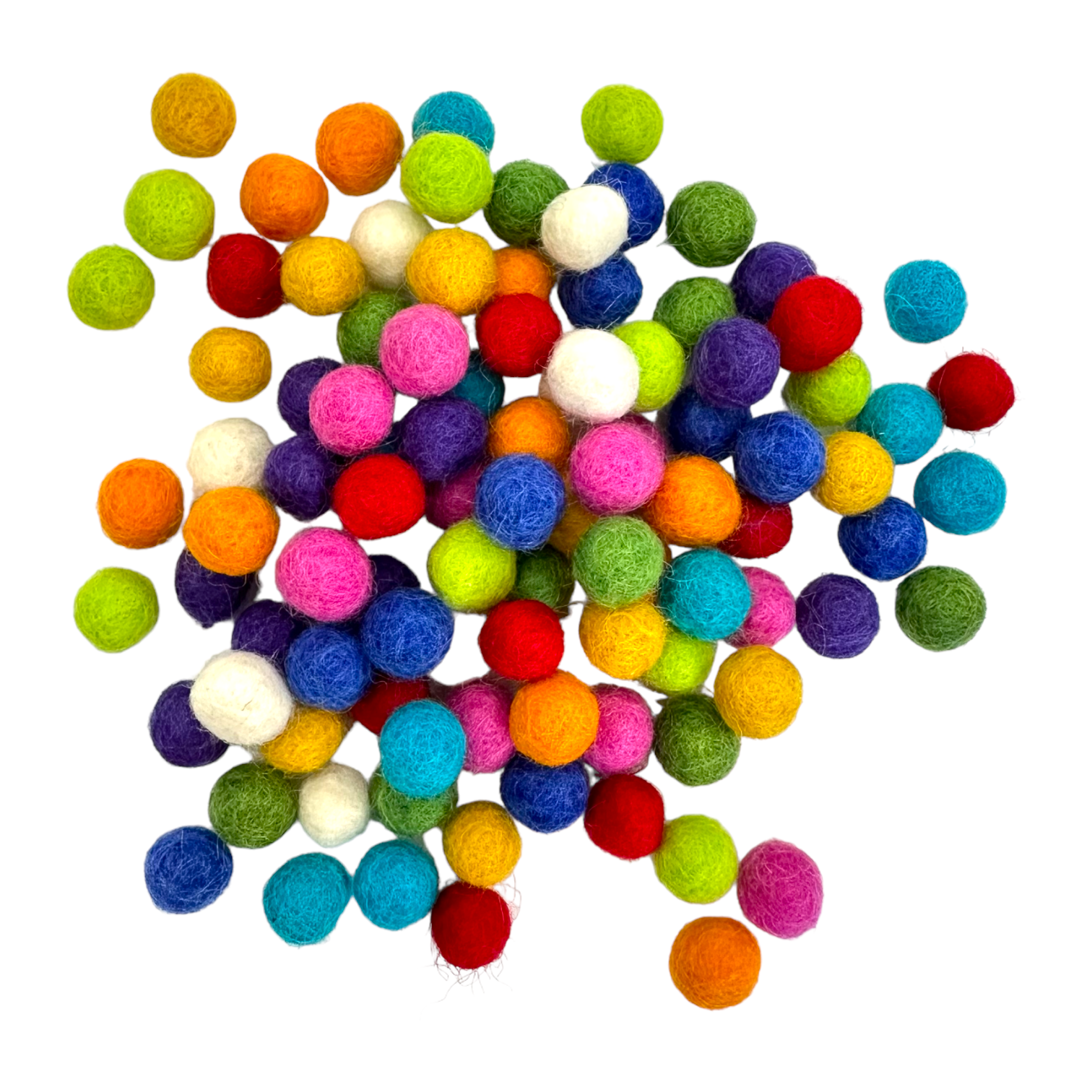 Small wool balls are designed to coordinate with Hundred Frame, to augment or substitute for the wood balls that come with the board. Includes 100 balls in 10 colors (10 of each). They are perfect for counting and sorting but can also be laid out into a mandala or put together to make a colorful scene.