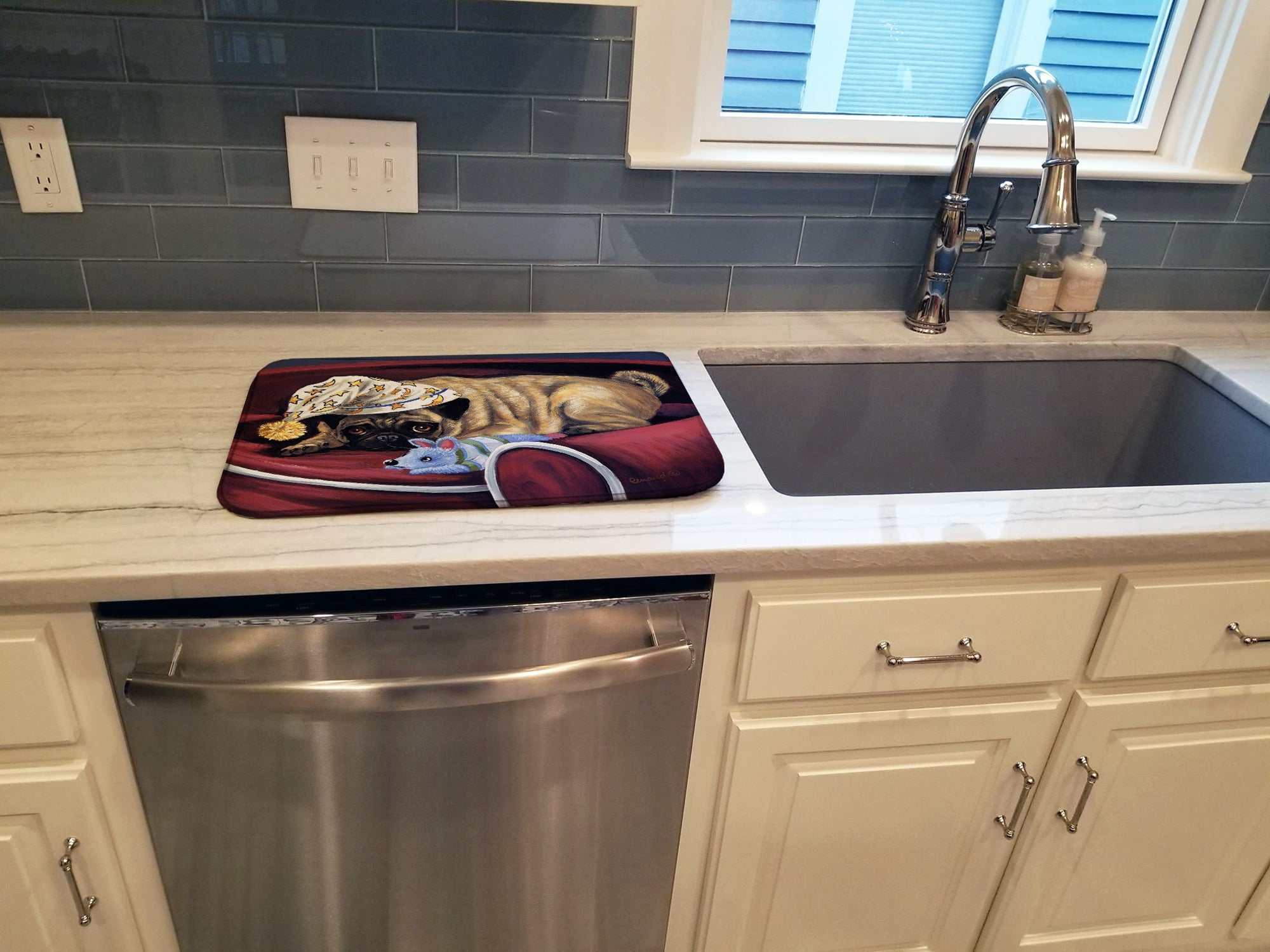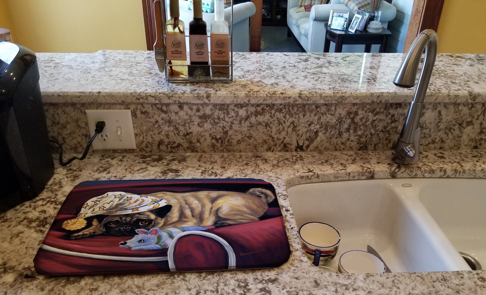 Decorate your space with our Pug artwork on a Dish Drying Mat. Say goodbye to messy countertops and soggy dish towels with our innovative dish drying mat. Our high-quality dish drying pad is designed to keep your countertops dry while offering a stylish and efficient solution. Whether you're air drying dishes, glasses, stemware, silverware, pots, pans, bottles, or even fruits and vegetables, our dish mat is the perfect choice. The 14 inches x 22 inches size fits most counters and dish drying racks, and the non-slip design ensures stability. Made with water-absorbent polyester and a polyurethane foam insert, our dish drying mat is not only functional but also durable. It's machine washable and printed in the USA for long-lasting use. The beautiful artwork adds flair to your kitchen decor, making it a perfect housewarming gift or present for any occasion. Upgrade your kitchen experience with our absorbent and versatile dish drying mat.