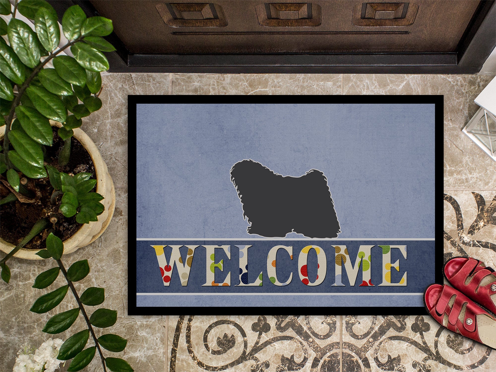 Decorate your space with our Puli artwork on a Doormat. Welcome your guests in style with our Artwork Door Mat, designed to withstand almost any weather condition. This mat, measuring approximately 24 by 36 inches, is held together by durable black binding tape. Its top layer, composed of polyester felt, is dyed with the eye-catching image you see on the mat. A few layers below provide the mat with stability, while its rubber bottom is stamped to help prevent slipping and ensures safety. Our mat works wonderfully as both an indoor or outdoor door mat. For cleaning, simply hose it off with water or use a power washer - no need for any cleaner that produces suds. Avoid scrubbing with a brush, instead, opt for the vacuum on floor setting. Designed manufactured and printed in the USA, this mat is a perfect addition to your porch, outdoor kitchen, entryway, or any indoor space. Its unique design makes it a charming decorative rug that greets your guests and adds a stylish touch to your home decor.