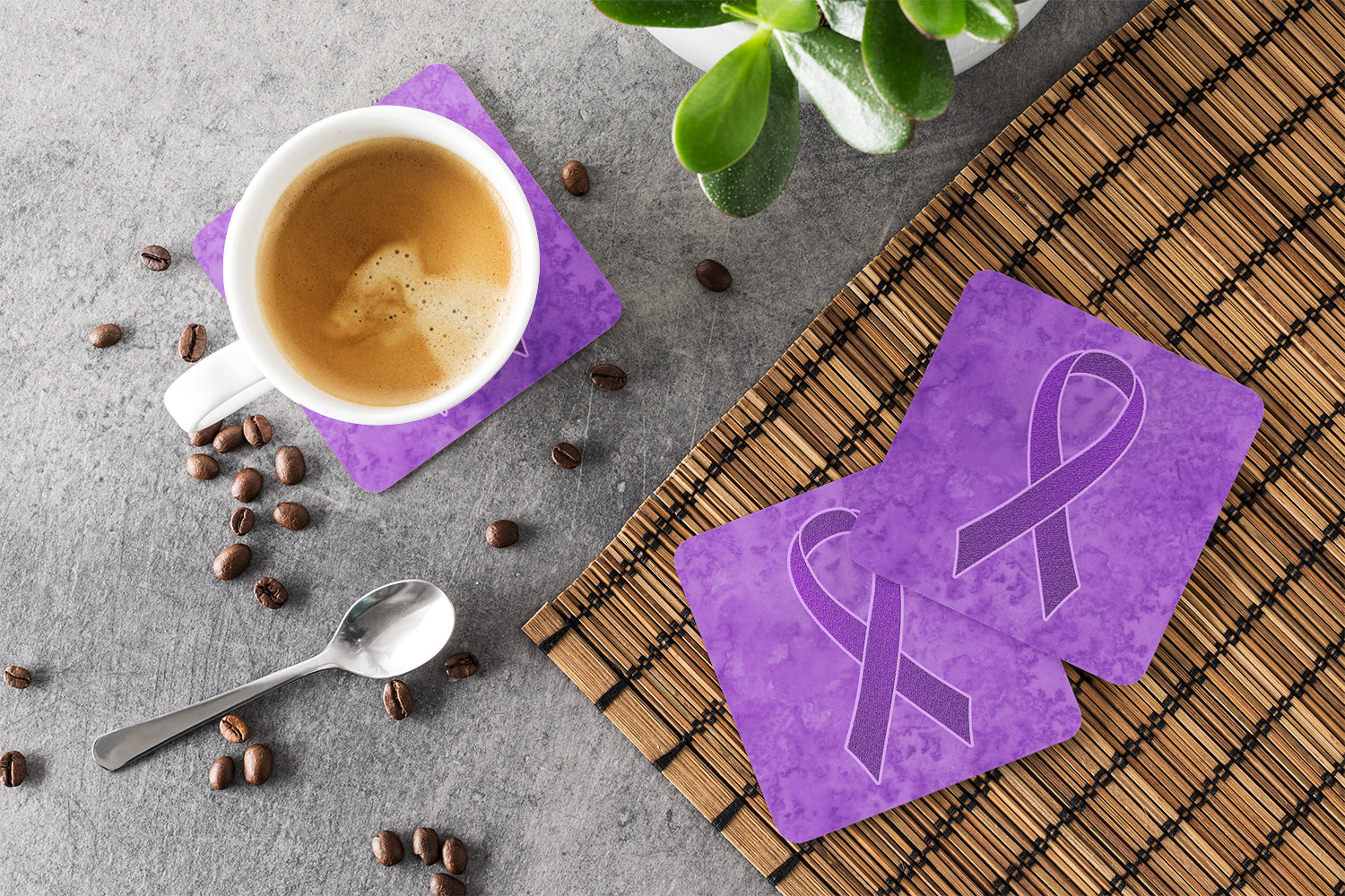 Decorate your space with our Purple Ribbon for Pancreatic and Leiomyosarcoma Cancer artwork on a Coaster set. Presenting our Set of 4 Foam Coasters, a stylish and practical addition to your table setting. Each square coaster, measuring 3 1/2 inches by 3 1/2 inches, is perfectly sized to accommodate various drinkware, from coffee mugs to tumblers. These coasters stand out with their full-color artwork, permanently dyed onto the material for a vibrant and fade-resistant finish. They're not just functional, they're a fashionable statement, adding a touch of flair to any gathering or event. Our foam coasters serve a dual purpose - they protect your table from water stains and are perfect for both hot and cold drinks. The material used is similar to that of our high-quality mouse pads, ensuring durability and heat resistance. These coasters are easy to maintain - simply wash them in the top of your dishwasher and lay flat to dry. The design won't come off, ensuring they retain their vivid colors for years. Pair them with one of our insulated coolers or huggers for a cohesive, thoughtful gift set. Enhance your beverage experience with our Set of 4 Foam Coasters.