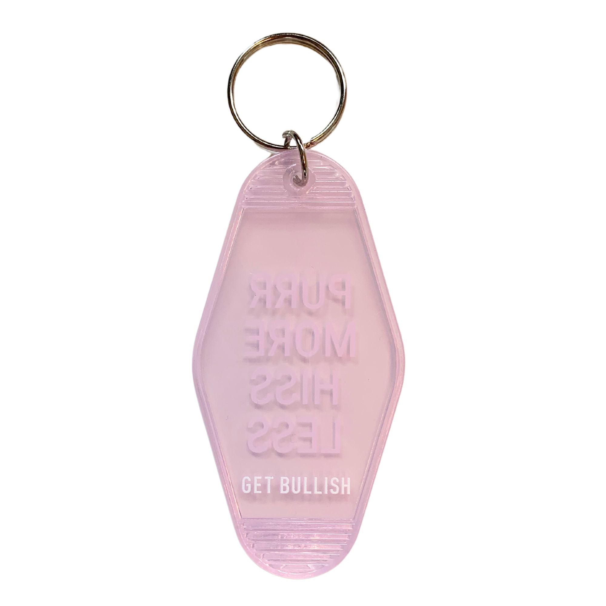 Keychain reads PURR MORE HISS LESS in motel style design.