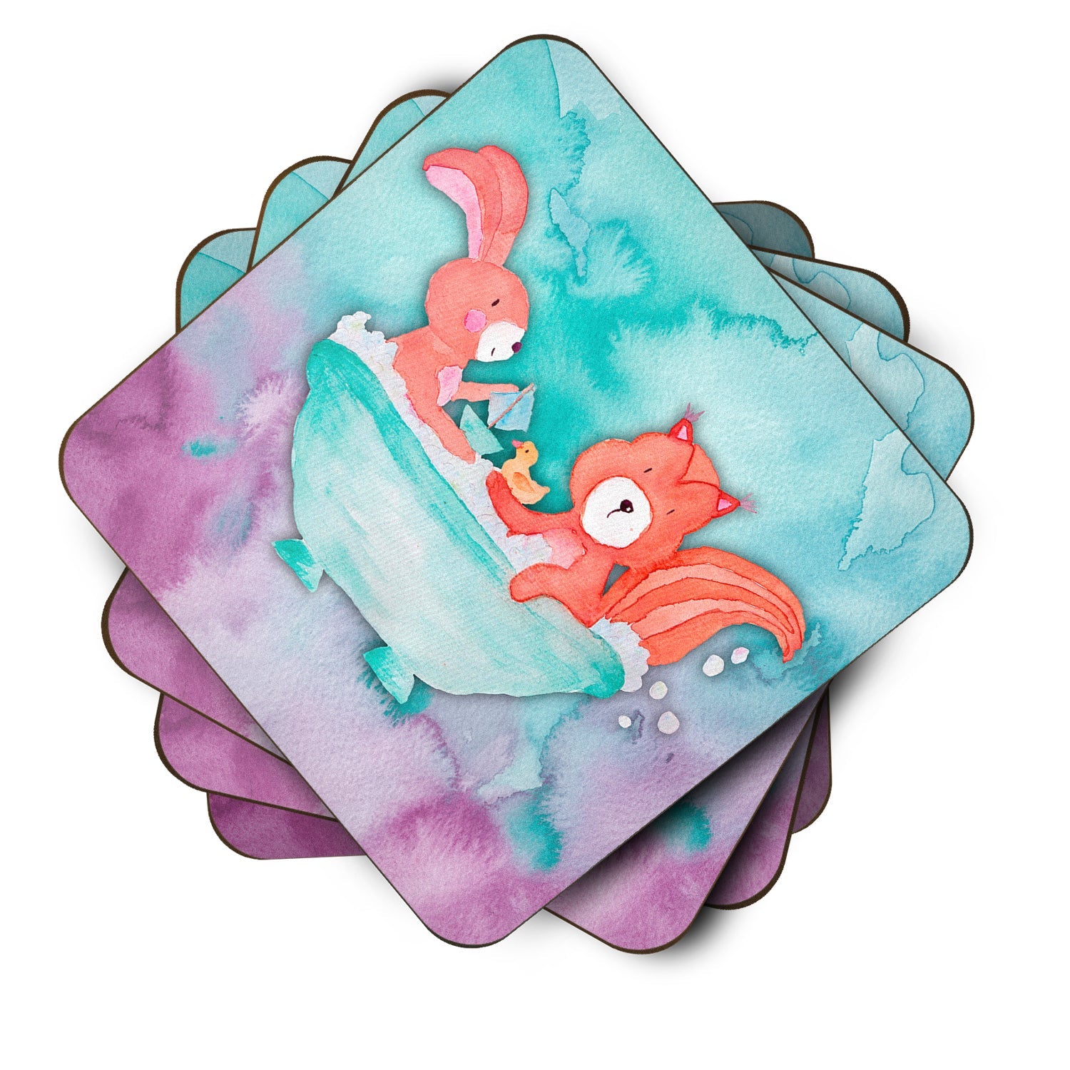 Decorate your space with our Rabbit artwork on a Coaster set. Presenting our Set of 4 Foam Coasters, a stylish and practical addition to your table setting. Each square coaster, measuring 3 1/2 inches by 3 1/2 inches, is perfectly sized to accommodate various drinkware, from coffee mugs to tumblers. These coasters stand out with their full-color artwork, permanently dyed onto the material for a vibrant and fade-resistant finish. They're not just functional, they're a fashionable statement, adding a touch of flair to any gathering or event. Our foam coasters serve a dual purpose - they protect your table from water stains and are perfect for both hot and cold drinks. The material used is similar to that of our high-quality mouse pads, ensuring durability and heat resistance. These coasters are easy to maintain - simply wash them in the top of your dishwasher and lay flat to dry. The design won't come off, ensuring they retain their vivid colors for years. Pair them with one of our insulated coolers or huggers for a cohesive, thoughtful gift set. Enhance your beverage experience with our Set of 4 Foam Coasters.