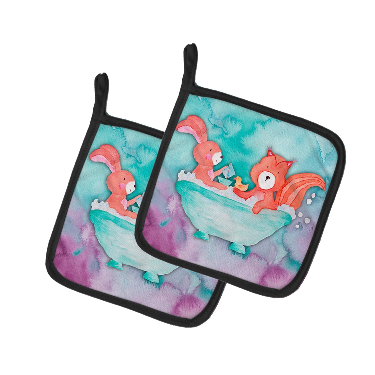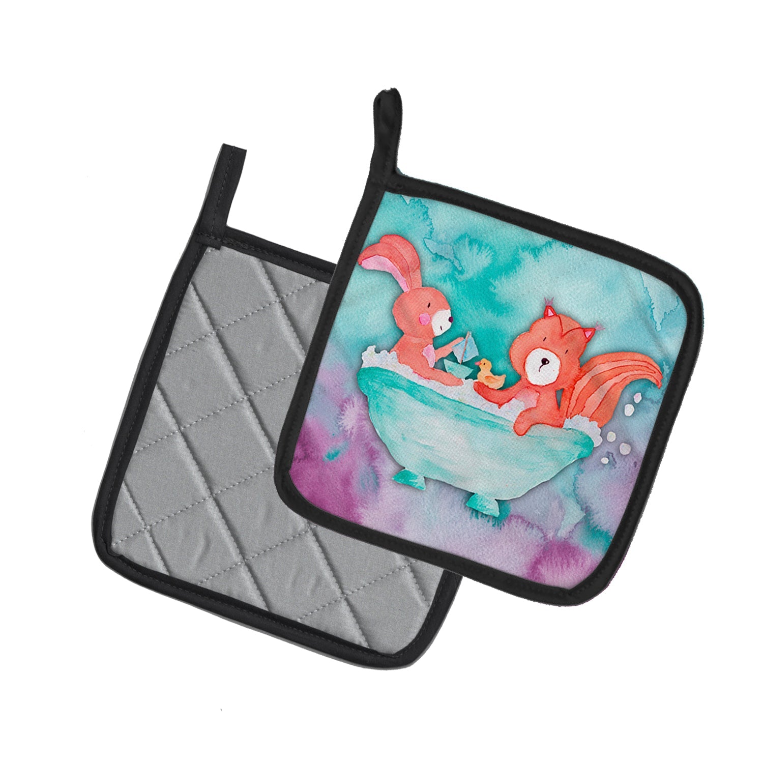 Decorate your space with our Rabbit artwork on a Pair of Pot Holders. A Pair of Pot Holders to match your kitchen decor. Made in the USA these are thick and functional. Full color artwork decorates the front polyester fabric of the hot pad and accented by a black trim. Use these at as a trivet for your Thanksgiving or Christmas tablescape. Filled with insulated fabric and quilted for durability. These colorful pot holders will make a great gift for your favorite home cook or executive chef. Each pot holder measures approximately 7 1/2 inches by 7 1/2 inches. A hanging tab is included.