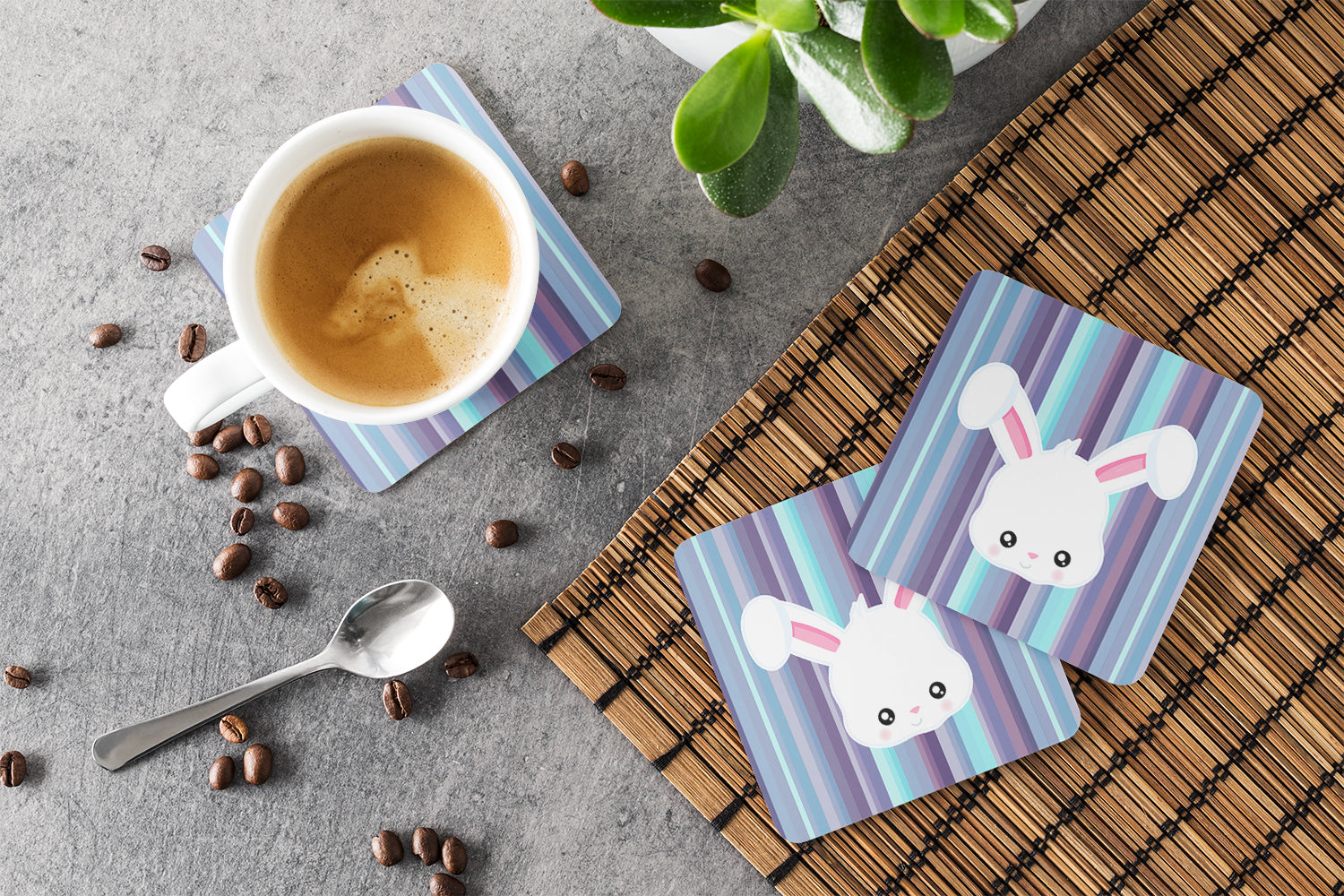 Decorate your space with our Rabbit artwork on a Coaster set. Presenting our Set of 4 Foam Coasters, a stylish and practical addition to your table setting. Each square coaster, measuring 3 1/2 inches by 3 1/2 inches, is perfectly sized to accommodate various drinkware, from coffee mugs to tumblers. These coasters stand out with their full-color artwork, permanently dyed onto the material for a vibrant and fade-resistant finish. They're not just functional, they're a fashionable statement, adding a touch of flair to any gathering or event. Our foam coasters serve a dual purpose - they protect your table from water stains and are perfect for both hot and cold drinks. The material used is similar to that of our high-quality mouse pads, ensuring durability and heat resistance. These coasters are easy to maintain - simply wash them in the top of your dishwasher and lay flat to dry. The design won't come off, ensuring they retain their vivid colors for years. Pair them with one of our insulated coolers or huggers for a cohesive, thoughtful gift set. Enhance your beverage experience with our Set of 4 Foam Coasters.