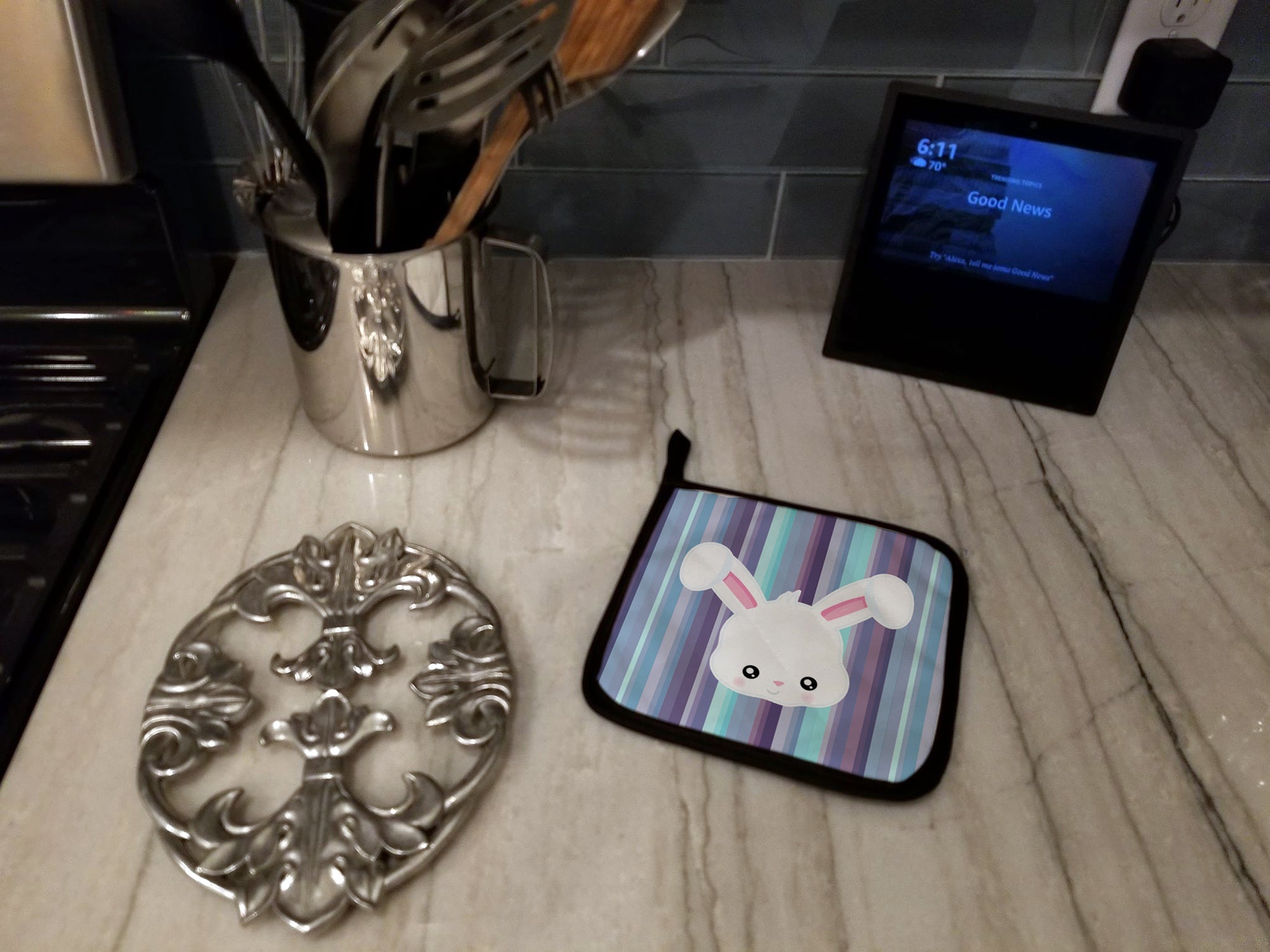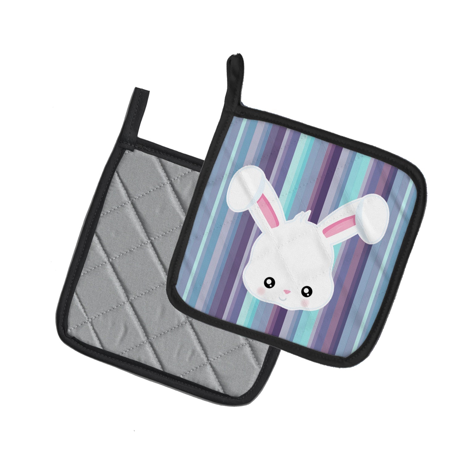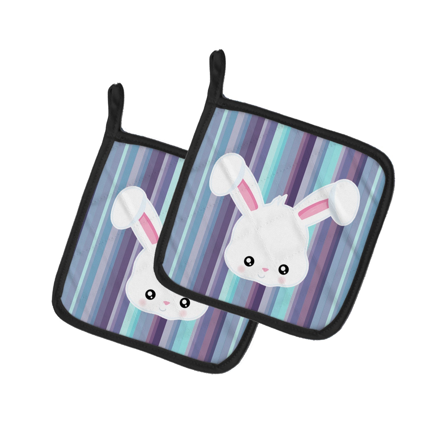 Decorate your space with our Rabbit artwork on a Pair of Pot Holders. A Pair of Pot Holders to match your kitchen decor. Made in the USA these are thick and functional. Full color artwork decorates the front polyester fabric of the hot pad and accented by a black trim. Use these at as a trivet for your Thanksgiving or Christmas tablescape. Filled with insulated fabric and quilted for durability. These colorful pot holders will make a great gift for your favorite home cook or executive chef. Each pot holder measures approximately 7 1/2 inches by 7 1/2 inches. A hanging tab is included.