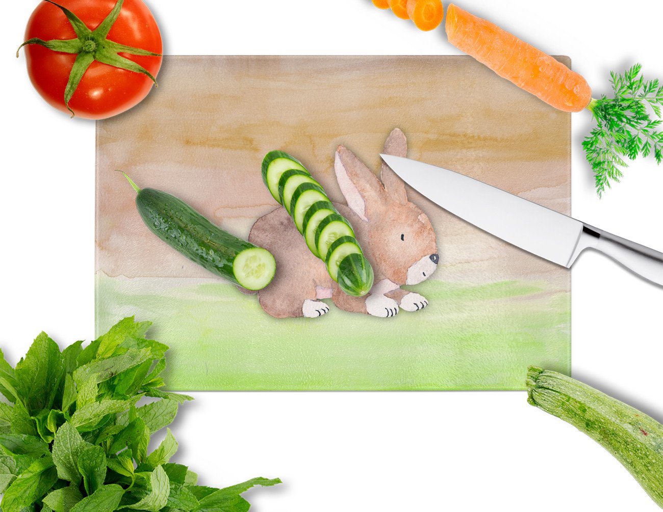 Decorate your space with our Rabbit artwork on a Cutting Board. Introduce your kitchen to the vibrant, large Decorative Glass Cutting Board from Caroline's Treasures. Crafted from resilient tempered glass, this board is not only a utilitarian necessity but also a colorful art piece. With its generous dimensions of 15 inches in height and 12 inches in length, it offers ample space for all your cutting needs. Every piece showcases captivating artwork from distinguished artists, bringing an aesthetic edge to your kitchen. Beyond its attractive design, this cutting board ensures your countertop stays pristine and unscathed, owing to its heat-resistant properties. Engineered with user convenience in mind, it features non-skid feet for stability, and rounded corners for additional safety. Its robust construction renders it virtually unbreakable, guaranteeing longevity. The board comes with protective feet bumpers, maintaining its position during use. This product is recommended to be hand washed only. Proudly printed and assembled in the United States, this cutting board exemplifies superior craftsmanship. With Caroline's Treasures' Decorative Glass Cutting Board, you're investing in a blend of functionality and artistic flair.