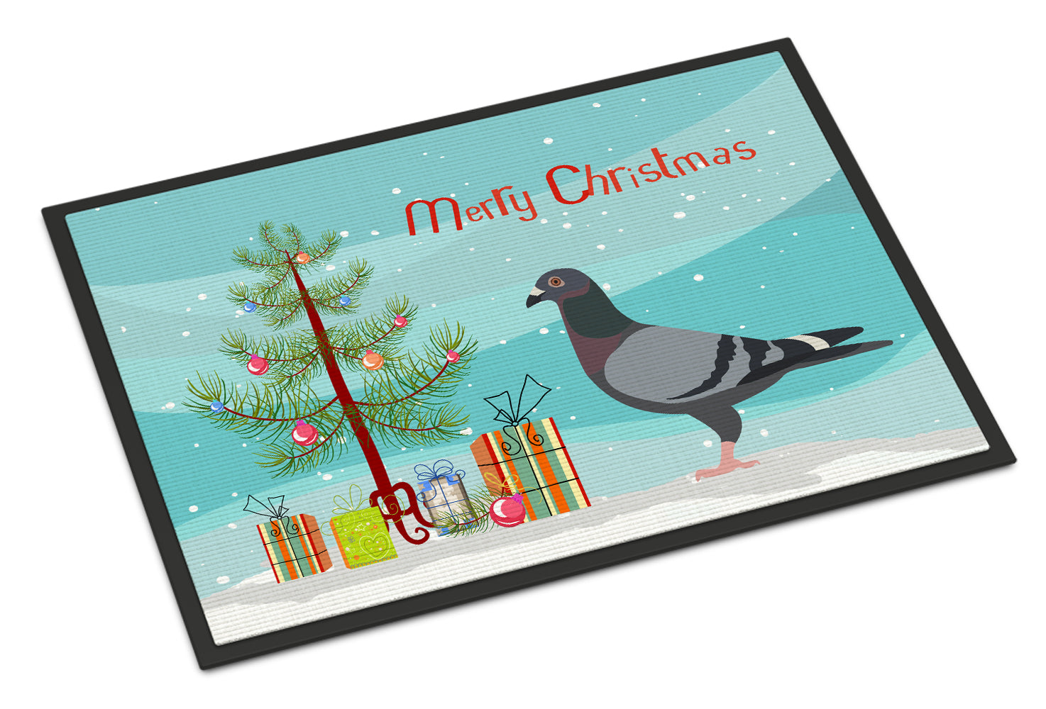 Decorate your space with our Christmas Racing Pigeon artwork on a Doormat. Welcome your guests in style with our Artwork Door Mat, designed to withstand almost any weather condition. This mat, measuring approximately 18 by 27 inches, is held together by durable black binding tape. Its top layer, composed of polyester felt, is dyed with the eye-catching image you see on the mat. A few layers below provide the mat with stability, while its rubber bottom is stamped to help prevent slipping and ensures safety. Our mat works wonderfully as both an indoor or outdoor door mat. For cleaning, simply hose it off with water or use a power washer - no need for any cleaner that produces suds. Avoid scrubbing with a brush, instead, opt for the vacuum on floor setting. Designed manufactured and printed in the USA, this mat is a perfect addition to your porch, outdoor kitchen, entryway, or any indoor space. Its unique design makes it a charming decorative rug that greets your guests and adds a stylish touch to your home decor.