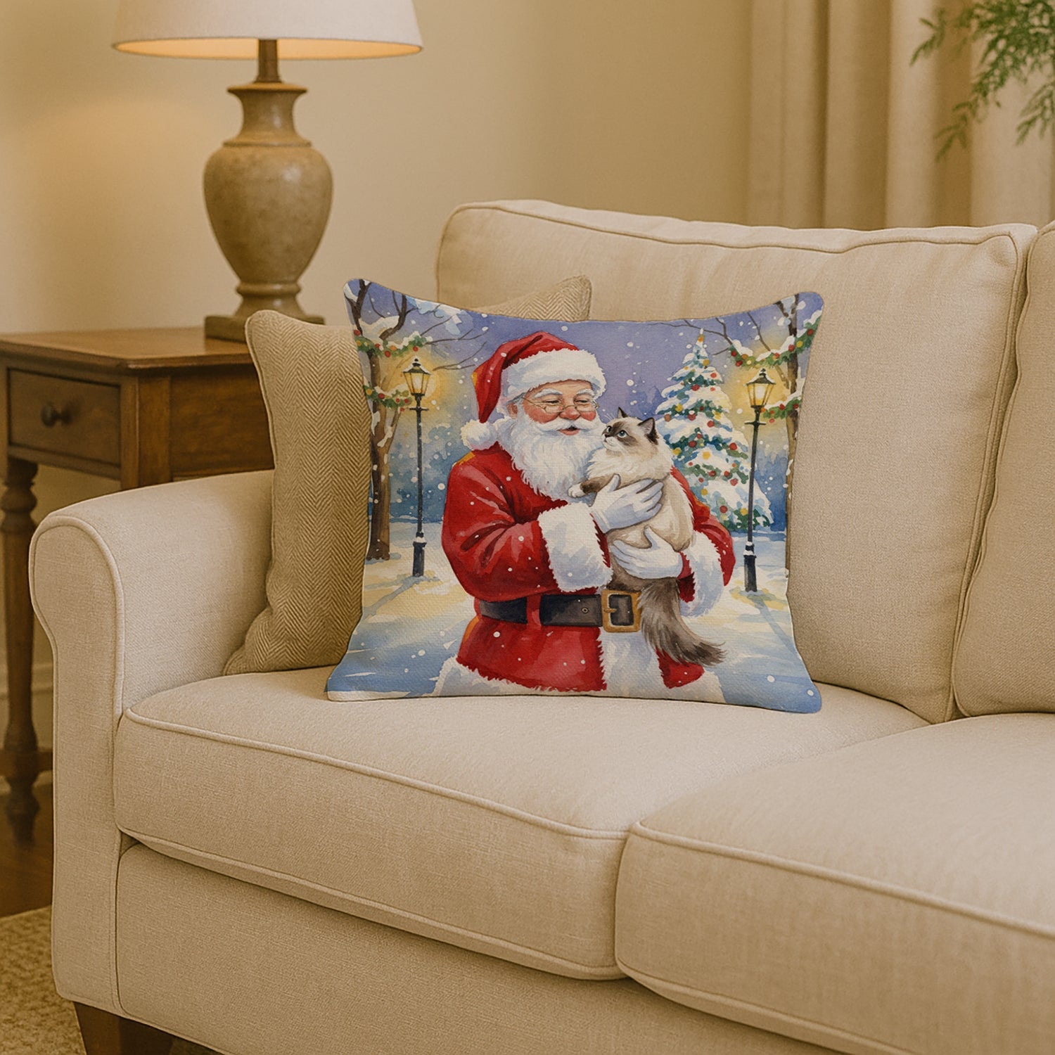 Throw Pillow featuring breed specific Ragdoll Cat artwork. Celebrate Christmas with this Christmas Pillow. Add a touch of vibrancy and comfort to your outdoor seating with Caroline's Treasures Fabric Decorative Pillow. Measuring approximately 14 inches by 14 inches, this outdoor pillow is crafted to elevate the appeal of your patio furniture, infusing it with vivid color and artistic flair. The pillow includes a 100% Polyester Fabric sham filled with a quality pillow form to provide superior comfort. Innovatively made from our brand new material, specifically woven for its water resistance, this pillow is designed for durability. The soft canvas fabric offers versatility in use, fit for your indoor couch or your outdoor patio, porch, or veranda. The fabric is dyed with colorfast dyes built for resilience against weather conditions, ensuring the pillow retains its beauty over time. Constructed by sewing three fabric pieces to create a sham, the polyester insert is then nestled inside to form the pillow, resulting in an overstuffed pillow that maintains its shape. Both the sham and the pillow insert are proudly made in the United States. As the pillows are handcrafted, there may be minor variations in size, further enhancing their unique charm. Experience comfort in style with Caroline's Treasures Fabric Decorative Pillow.