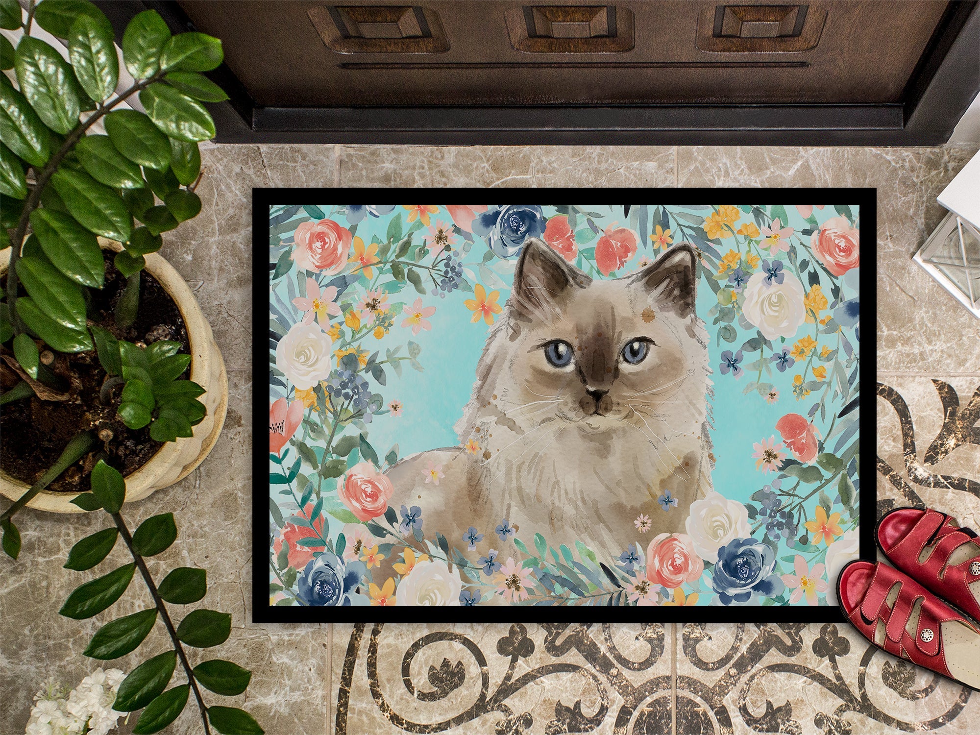 Decorate your space with our Ragdoll artwork on a Doormat. Welcome your guests in style with our Artwork Door Mat, designed to withstand almost any weather condition. This mat, measuring approximately 24 by 36 inches, is held together by durable black binding tape. Its top layer, composed of polyester felt, is dyed with the eye-catching image you see on the mat. A few layers below provide the mat with stability, while its rubber bottom is stamped to help prevent slipping and ensures safety. Our mat works wonderfully as both an indoor or outdoor door mat. For cleaning, simply hose it off with water or use a power washer - no need for any cleaner that produces suds. Avoid scrubbing with a brush, instead, opt for the vacuum on floor setting. Designed manufactured and printed in the USA, this mat is a perfect addition to your porch, outdoor kitchen, entryway, or any indoor space. Its unique design makes it a charming decorative rug that greets your guests and adds a stylish touch to your home decor.