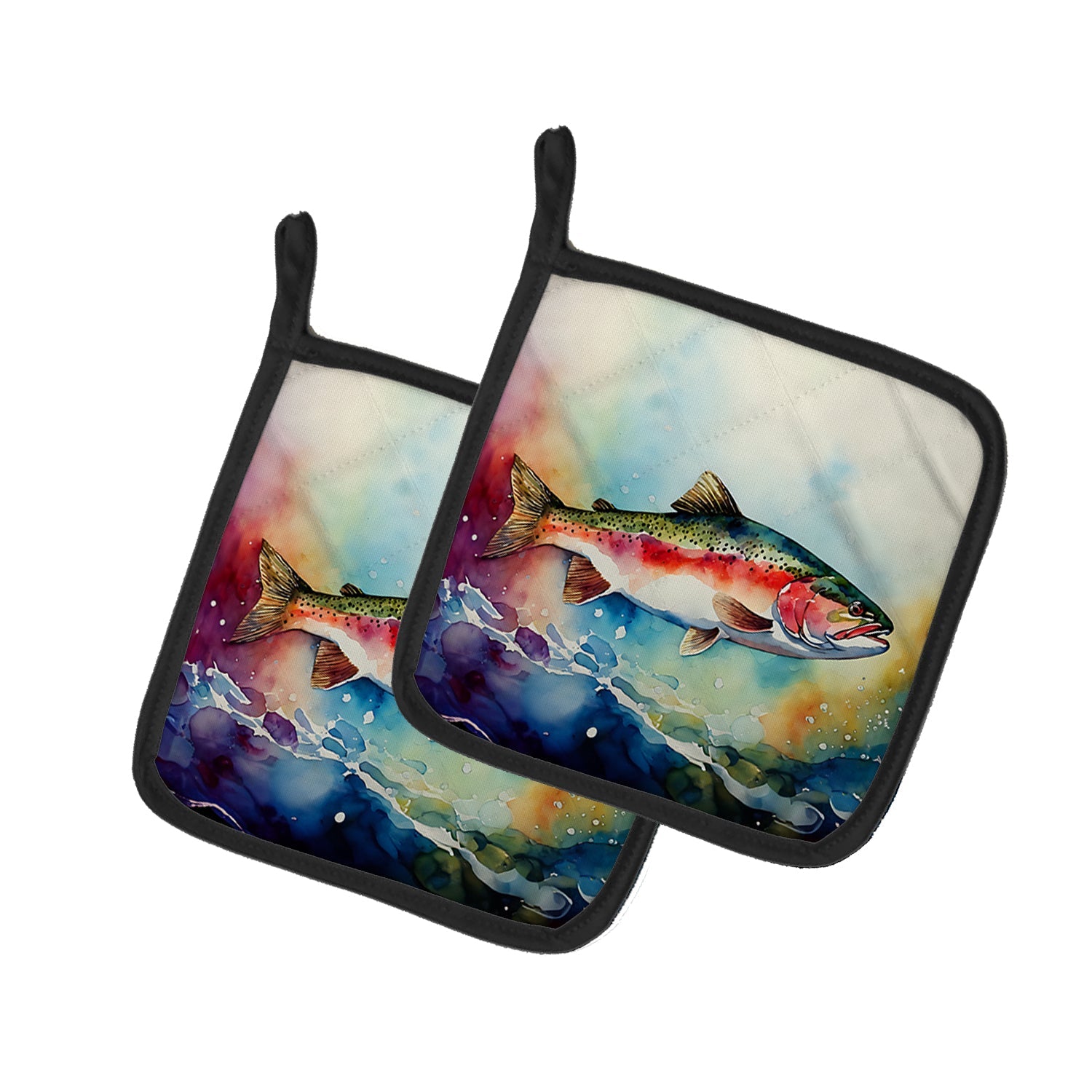 Decorate your space with our Rainbow Trout artwork on a Pair of Pot Holders. A Pair of Pot Holders to match your kitchen decor. Made in the USA these are thick and functional. Full color artwork decorates the front polyester fabric of the hot pad and accented by a black trim. Use these at as a trivet for your Thanksgiving or Christmas tablescape. Filled with insulated fabric and quilted for durability. These colorful pot holders will make a great gift for your favorite home cook or executive chef. Each pot holder measures approximately 7 1/2 inches by 7 1/2 inches. A hanging tab is included.