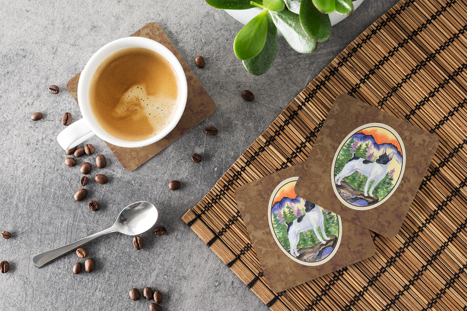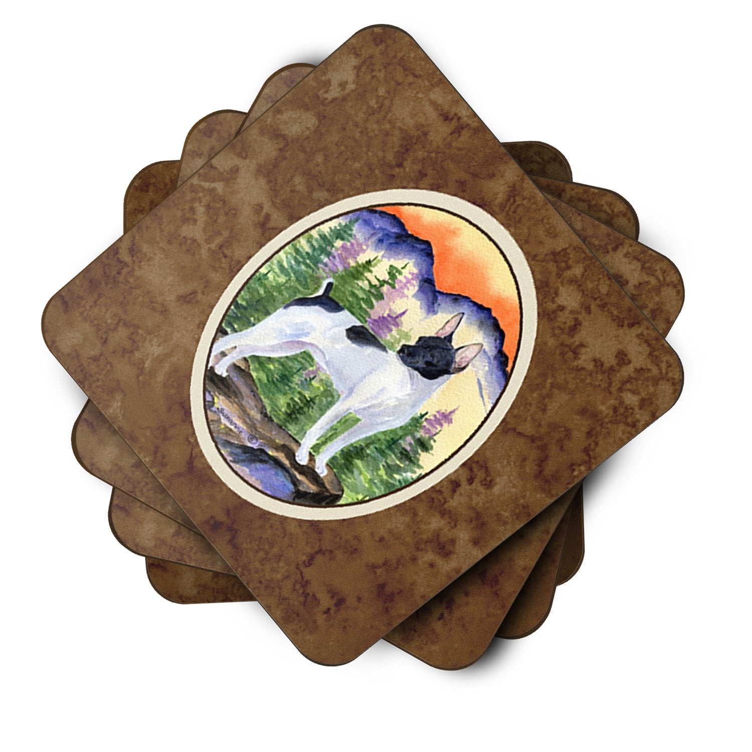 Decorate your space with our Rat Terrier artwork on a Coaster set. Presenting our Set of 4 Foam Coasters, a stylish and practical addition to your table setting. Each square coaster, measuring 3 1/2 inches by 3 1/2 inches, is perfectly sized to accommodate various drinkware, from coffee mugs to tumblers. These coasters stand out with their full-color artwork, permanently dyed onto the material for a vibrant and fade-resistant finish. They're not just functional, they're a fashionable statement, adding a touch of flair to any gathering or event. Our foam coasters serve a dual purpose - they protect your table from water stains and are perfect for both hot and cold drinks. The material used is similar to that of our high-quality mouse pads, ensuring durability and heat resistance. These coasters are easy to maintain - simply wash them in the top of your dishwasher and lay flat to dry. The design won't come off, ensuring they retain their vivid colors for years. Pair them with one of our insulated coolers or huggers for a cohesive, thoughtful gift set. Enhance your beverage experience with our Set of 4 Foam Coasters.