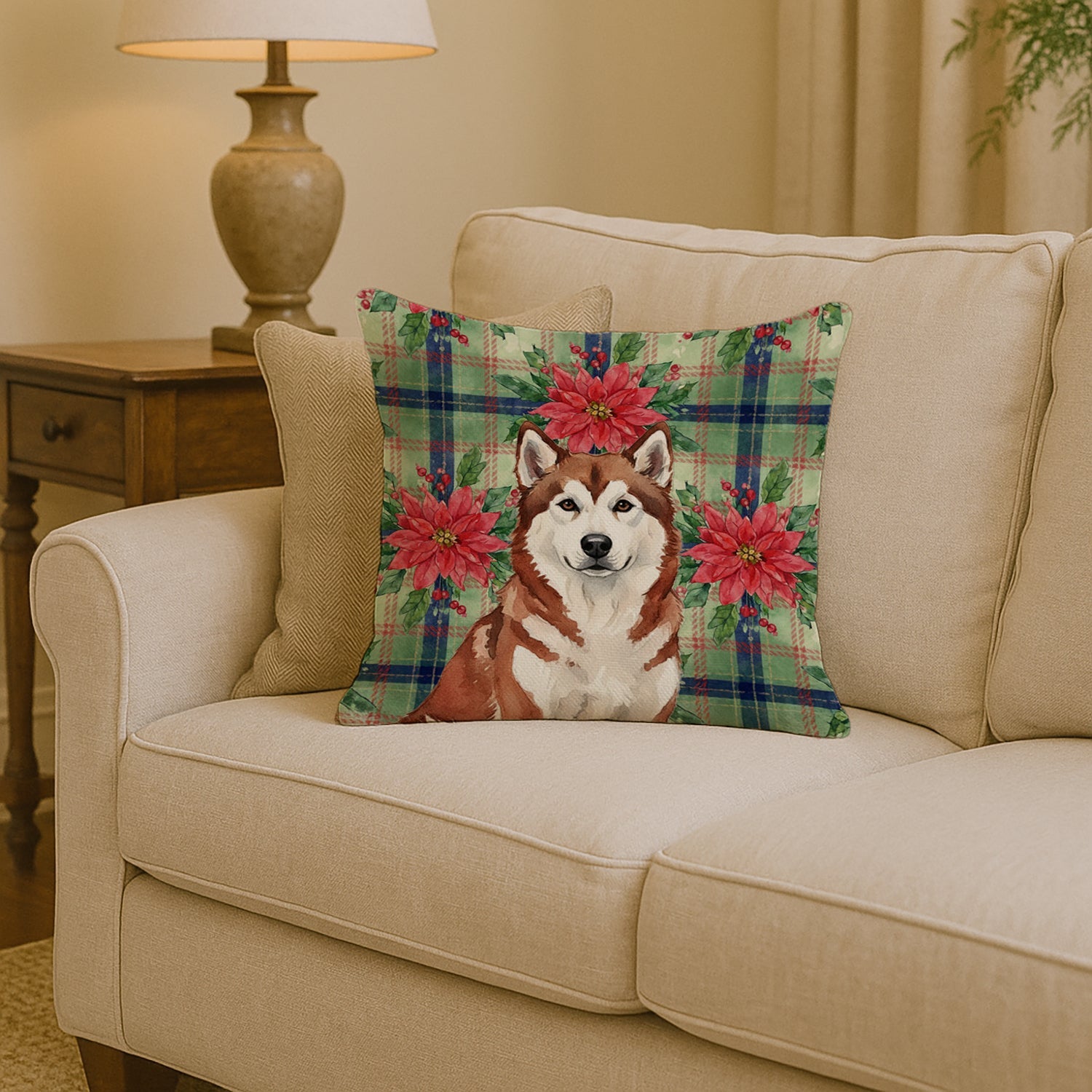 Throw Pillow featuring breed specific Alaskan Malamute artwork. Celebrate Christmas with this Christmas Pillow. Add a touch of vibrancy and comfort to your outdoor seating with Caroline's Treasures Fabric Decorative Pillow. Measuring approximately 14 inches by 14 inches, this outdoor pillow is crafted to elevate the appeal of your patio furniture, infusing it with vivid color and artistic flair. The pillow includes a 100% Polyester Fabric sham filled with a quality pillow form to provide superior comfort. Innovatively made from our brand new material, specifically woven for its water resistance, this pillow is designed for durability. The soft canvas fabric offers versatility in use, fit for your indoor couch or your outdoor patio, porch, or veranda. The fabric is dyed with colorfast dyes built for resilience against weather conditions, ensuring the pillow retains its beauty over time. Constructed by sewing three fabric pieces to create a sham, the polyester insert is then nestled inside to form the pillow, resulting in an overstuffed pillow that maintains its shape. Both the sham and the pillow insert are proudly made in the United States. As the pillows are handcrafted, there may be minor variations in size, further enhancing their unique charm. Experience comfort in style with Caroline's Treasures Fabric Decorative Pillow.