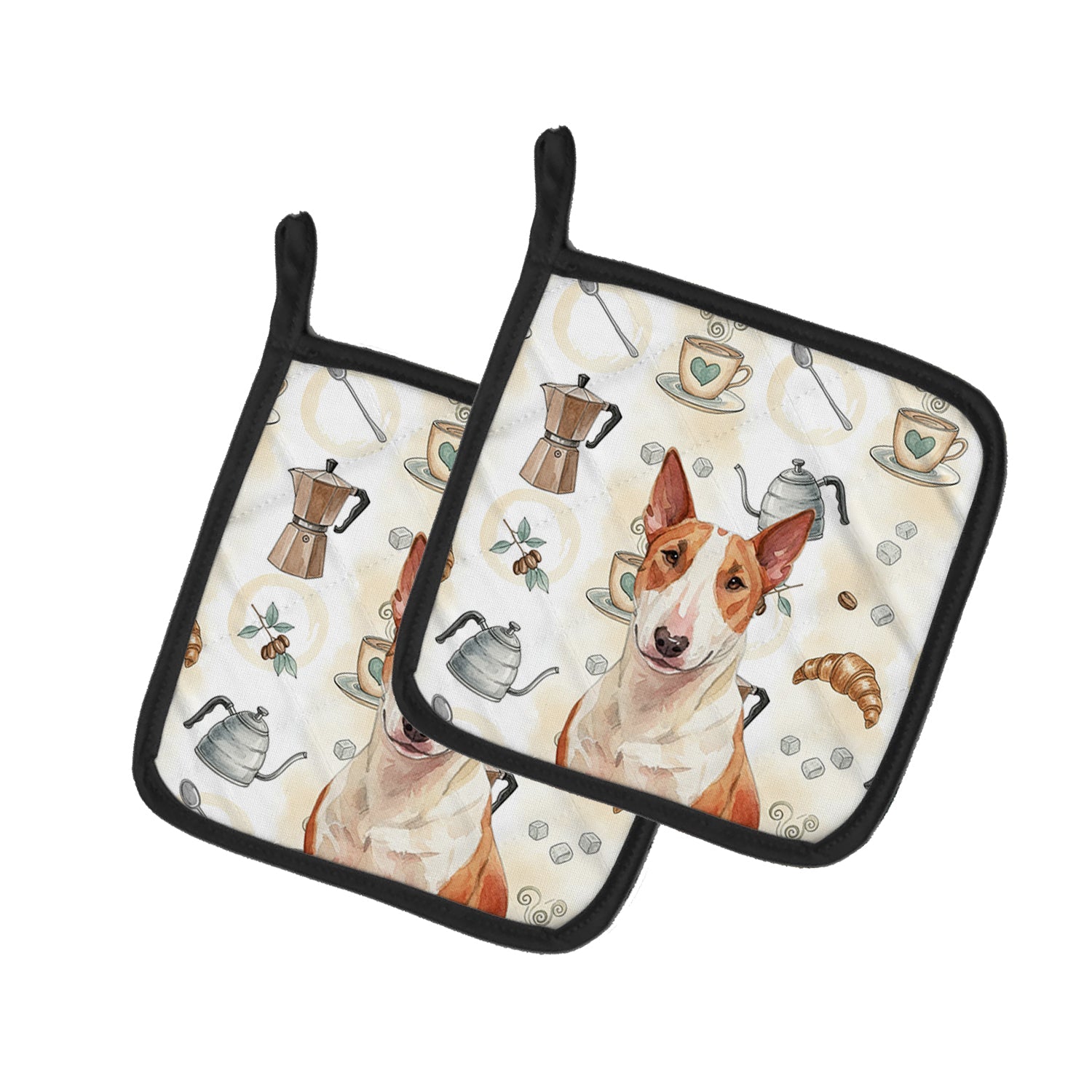 Pair of Pot Holders featuring breed specific Bull Terrier artwork. Add warmth, personality, and function to your kitchen with our Coffee Time Pot Holder Pair. Each set includes two quilted hot pads, featuring original full-color watercolor artwork on a soft polyester front accented by black trim. Crafted with multiple layers for performance: Top Layer: Vibrant artwork permanently dyed into polyester fabric. Middle Layer: US-manufactured insulated material with breathable polyester fibers and a reflective metalized film that reflects heat back to its source. Bottom Layer: A silver heat-resistant backing for extra protection. Each pot holder measures 7.5" x 7.5", includes a hanging tab, and is quilted for durability. Use them to protect your hands, countertops, and tabletops — or as decorative trivets for Thanksgiving, Christmas, or everyday meals.