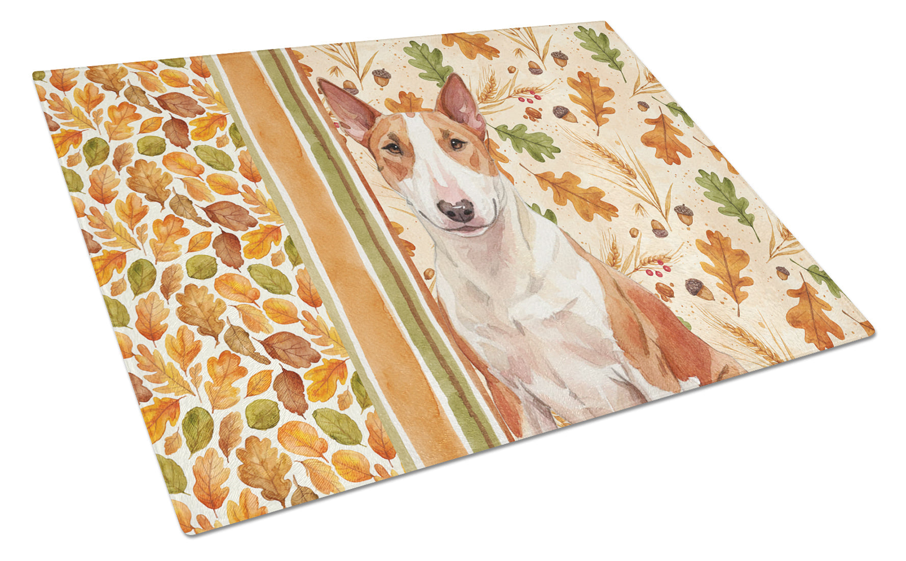 Glass Cutting Board featuring breed specific Bull Terrier artwork. Celebrate Thanksgiving with this Thanksgiving Cutting Board. Introduce your kitchen to the vibrant, large Decorative Glass Cutting Board from Caroline's Treasures. Crafted from resilient tempered glass, this board is not only a utilitarian necessity but also a colorful art piece. With its generous dimensions of 15 inches in height and 12 inches in length, it offers ample space for all your cutting needs. Every piece showcases captivating artwork from distinguished artists, bringing an aesthetic edge to your kitchen. Beyond its attractive design, this cutting board ensures your countertop stays pristine and unscathed, owing to its heat-resistant properties. Engineered with user convenience in mind, it features non-skid feet for stability, and rounded corners for additional safety. Its robust construction renders it virtually unbreakable, guaranteeing longevity. The board comes with protective feet bumpers, maintaining its position during use. This product is recommended to be hand washed only. Proudly printed and assembled in the United States, this cutting board exemplifies superior craftsmanship. With Caroline's Treasures' Decorative Glass Cutting Board, you're investing in a blend of functionality and artistic flair.