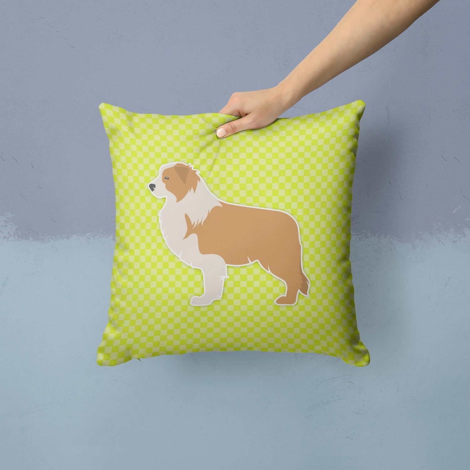 Red Border Collie Checkerboard Green Throw Pillow - 14x14 Decorative Pillow – Art for Your Home & Patio BB3822PW1414