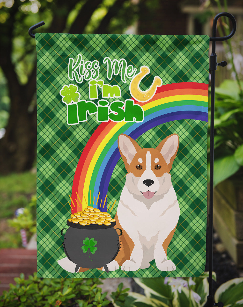 Red Cardigan Corgi St. Patrick's Garden Flag – "Kiss Me I’m Irish" with Pot of Gold & Rainbow