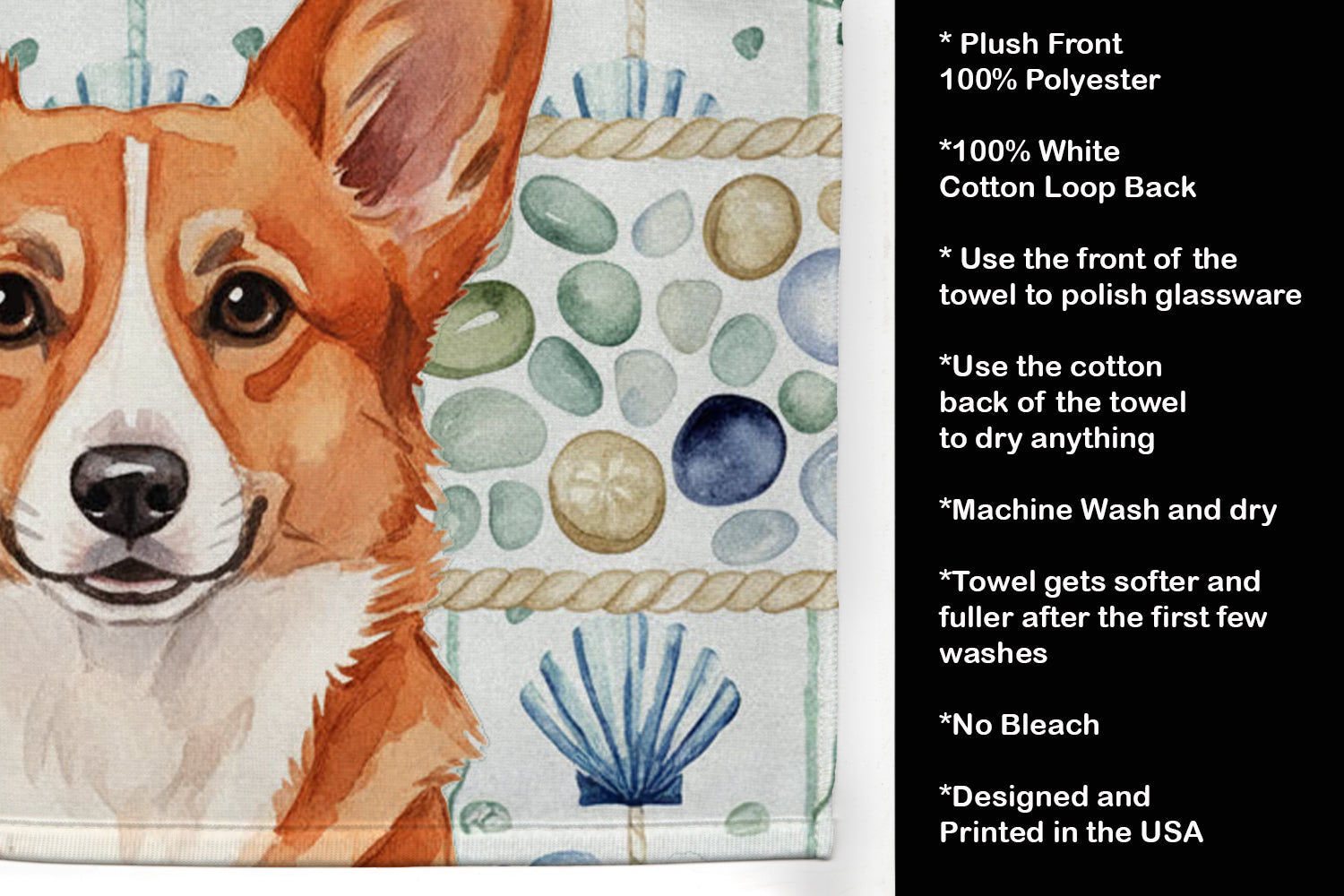 Kitchen Towel featuring breed specific Cardigan Welsh Corgi artwork. Bring breezy coastal charm to your kitchen or bath with our plush velour towel featuring original watercolor artwork. The soft minky polyester front showcases vivid seashell and starfish designs with a dog portrait, perfect for polishing glassware to a brilliant shine. The 100% cotton terry loop back delivers superior absorbency for drying hands, dishes, or counters. Artwork is dyed directly into the fibers for lasting color that won’t crack or peel. Each towel measures 15" x 25", with bound edges to maintain shape after repeated washes. Machine washable and tumble dry low for easy care. Designed and printed in the USA, these towels combine function and style—ideal for beach homes, coastal kitchens, or as thoughtful gifts.