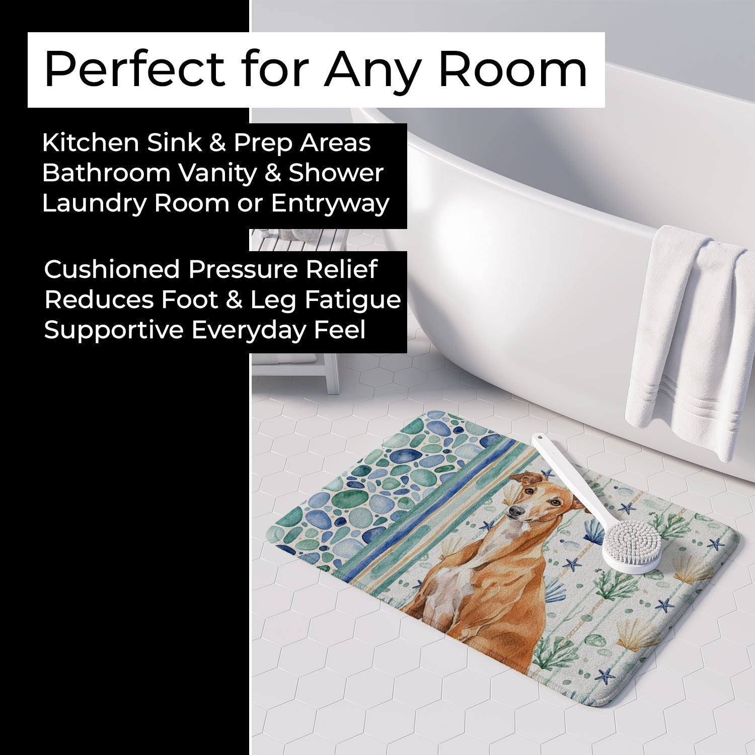 Shown here is the Red Greyhound Coastal Sea Glass Memory Foam Kitchen Mat from Caroline's Treasures featuring artwork of a Greyhound in a Everyday design. The detailed illustration and vibrant colors make it a standout accent that celebrates both seasonal style and love for the subject. This image features a calming coastal watercolor pattern with soft seashells, seaweed, starfish, and pebble-inspired accents arranged in a repeating design. The soothing palette of blues, greens, and sandy neutrals creates a relaxed, beach-inspired look that adds a fresh and tranquil feel to any space. Everyday décor celebrates personal style and the small moments that make a house feel like home. Thoughtful designs add warmth and personality that can be enjoyed year-round. Transform your floor into a work of art with Caroline's Treasures' Memory Foam Mat. This mat offers not only a stunning visual appeal but also a luxurious, plush feel that's incredibly comfortable to the touch. It's a versatile, machine-washable mat designed for both bath and kitchen use, ensuring you experience the best in comfort and convenience. Care Instructions: Maintaining this memory foam mat is a breeze. Simply follow the care instructions on the product tag. It's recommended to wash in cold water and dry on a low-temperature setting in the dryer. This ensures the mat retains its quality and longevity, allowing you to enjoy its beauty and comfort for a long time. Caroline's Treasures' Memory Foam Mat Machine Washable is the perfect blend of artistry, comfort, and practicality, making it a standout addition to any space. Upgrade your home decor with this versatile and stylish mat today. Greyhounds are sleek sighthounds known for their speed and graceful movement. Despite their athletic ability, this breed is admired for its gentle temperament and calm disposition. Makes a heartfelt gift for: Greyhound owners, Dogs lovers, Everyday gifts, pet parents, friends who adore their Greyhound, or anyone celebrating Dogs.