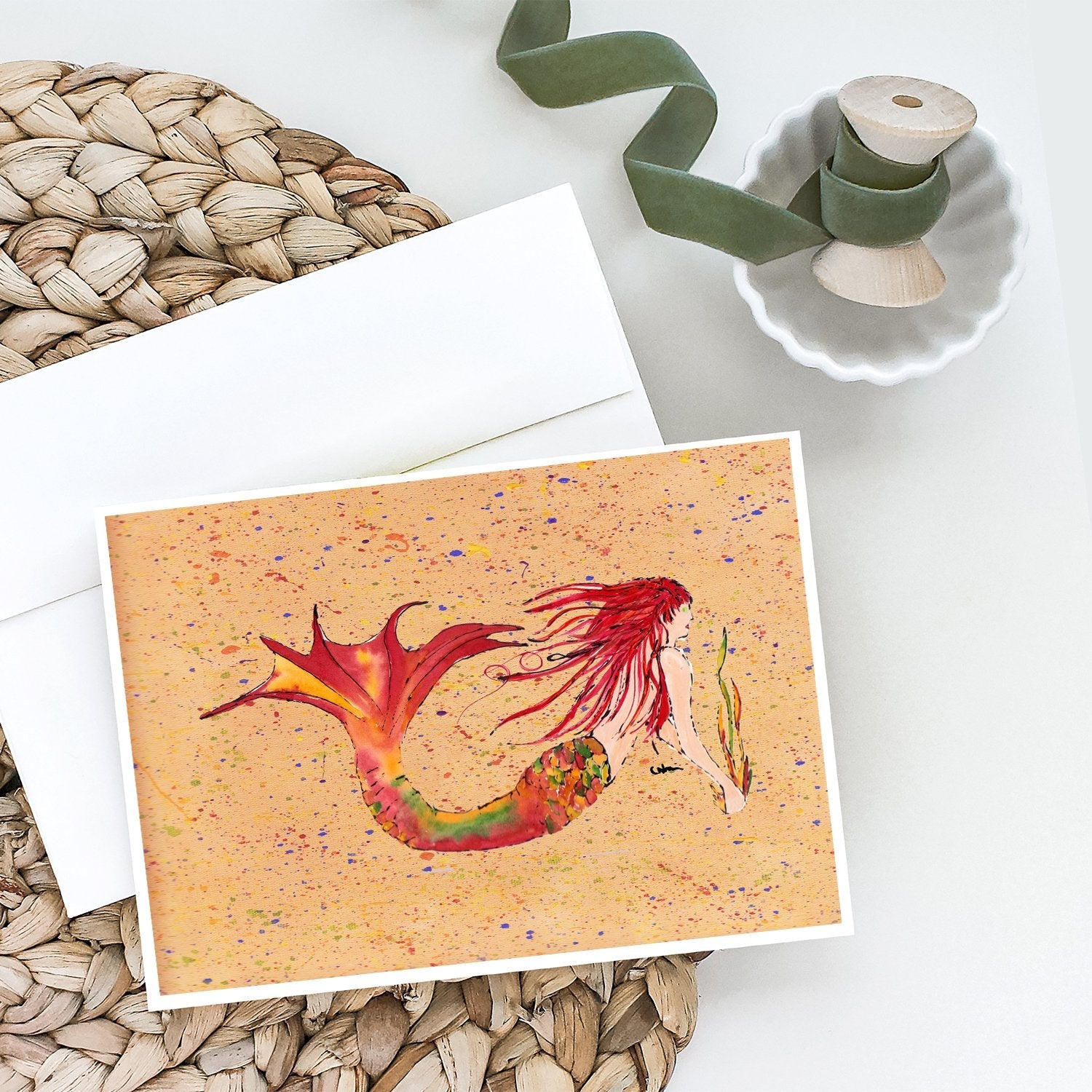 Red Headed Ginger Mermaid on Coral Greeting Cards -  Blank Note Cards – 8-Pack of Artist-Designed Cards with Envelopes