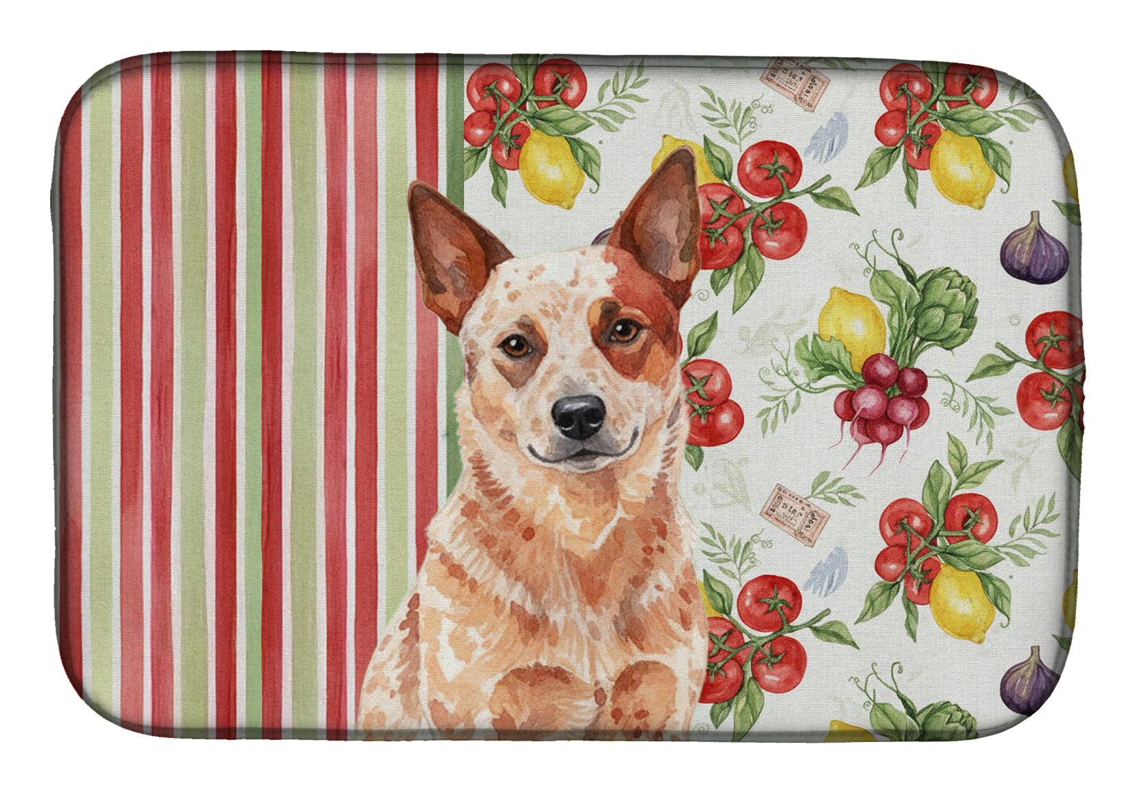 Shown here is the Red Heeler Australian Cattle Dog Vegetables Dish Drying Mat from Caroline's Treasures featuring artwork of a Australian Cattle Dog in a Everyday design. The detailed illustration and vibrant colors make it a standout accent that celebrates both seasonal style and love for the subject. This image features a vibrant watercolor vegetable pattern with tomatoes, lemons, artichokes, figs, radishes, and leafy greens arranged in a repeating design, paired with classic red and green stripes. The bright, garden-fresh palette creates a cheerful, farmhouse-inspired look that feels lively, welcoming, and perfect for kitchen décor. Everyday décor celebrates personal style and the small moments that make a house feel like home. Thoughtful designs add warmth and personality that can be enjoyed year-round. Say goodbye to messy countertops and soggy dish towels with our innovative dish drying mat. Our high-quality dish drying pad is designed to keep your countertops dry while offering a stylish and efficient solution. Whether you're air drying dishes, glasses, stemware, silverware, pots, pans, bottles, or even fruits and vegetables, our dish mat is the perfect choice. The 14 inches x 21 inches size fits most counters and dish drying racks, and the non-slip design ensures stability. Made with water-absorbent polyester and a polyurethane foam insert, our dish drying mat is not only functional but also durable. It's machine washable and printed in the USA for long-lasting use. The beautiful artwork adds flair to your kitchen decor, making it a perfect housewarming gift or present for any occasion. Upgrade your kitchen experience with our absorbent and versatile dish drying mat. Perfect for: Kitchen counters and sinks, everyday dish drying and countertop protection, Dogs-themed homes, or year-round use for Australian Cattle Dog lovers. Australian Cattle Dogs, also known as Blue Heelers or Heelers, are highly intelligent and energetic working dogs. Bred for herding, this breed is valued for its endurance, loyalty, and strong problem-solving ability. Makes a heartfelt gift for: Australian Cattle Dog owners, Dogs lovers, Everyday gifts, pet parents, friends who adore their Australian Cattle Dog, or anyone celebrating Dogs.