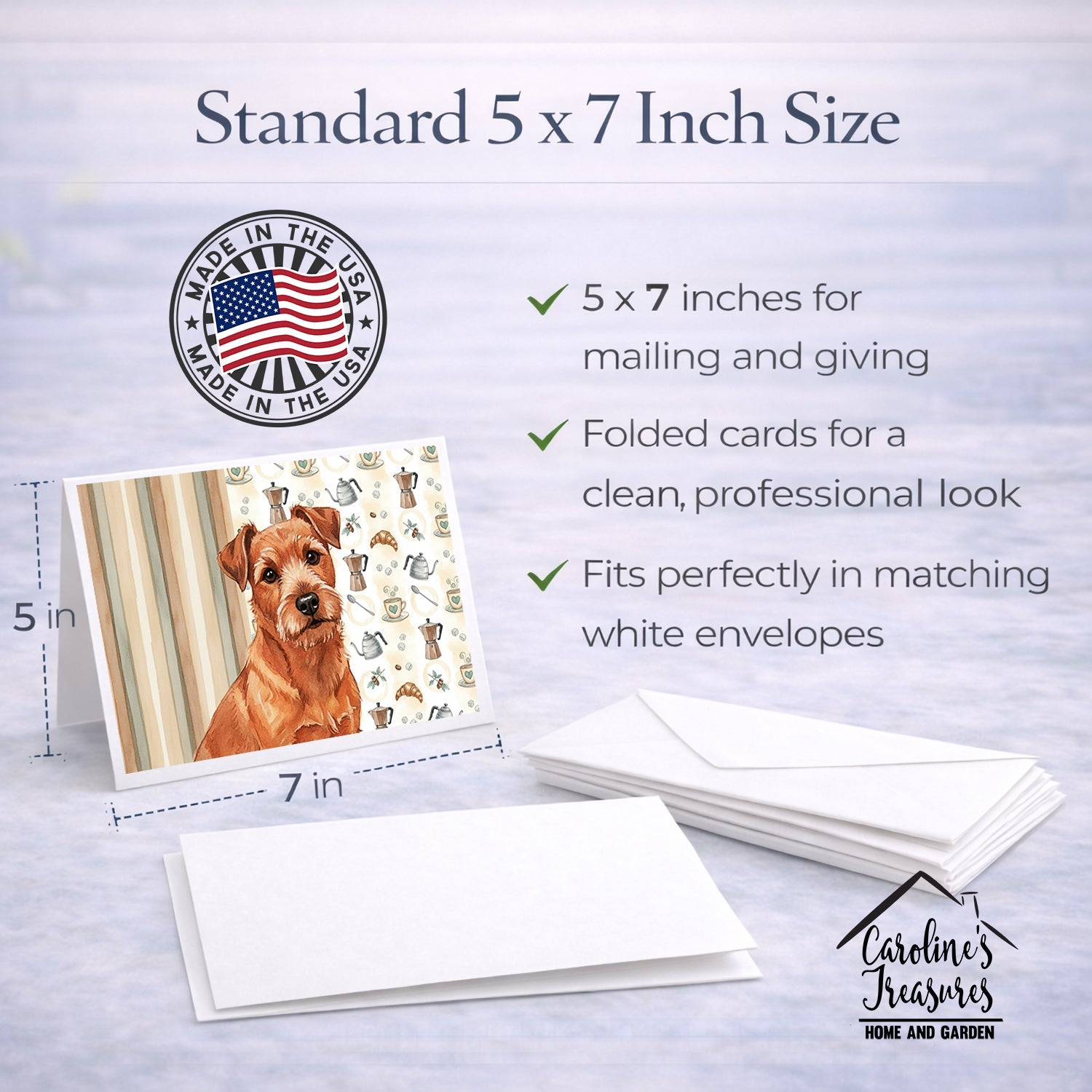 Shown here is the Red Norfolk Terrier Coffee Bar Greeting Cards Pack of 8 from Caroline's Treasures featuring artwork of a Norfolk Terrier in a Everyday design. The detailed illustration and vibrant colors make it a standout accent that celebrates both seasonal style and love for the subject. This image features a cozy watercolor coffee-themed pattern with illustrated mugs, moka pots, kettles, croissants, coffee beans, and sugar cubes arranged in a repeating design. Soft neutral tones with warm browns, creams, and subtle sage accents create an inviting, café-inspired look that feels comforting and relaxed. Everyday décor celebrates personal style and the small moments that make a house feel like home. Thoughtful designs add warmth and personality that can be enjoyed year-round. Celebrate special moments with Caroline's Treasures Printed Greeting Card Pack. This pack includes eight beautifully folded 5x7 cards, accompanied by eight matching white envelopes. With blank interiors, these cards provide ample space for your personalized messages and heartfelt holiday greetings. Each card features captivating full-color artwork, meticulously printed in our facility on high-quality 80 lb cover stock or 216 GSM. The super smooth finish of the white cards enhances the visual impact of the artwork, creating a truly stunning presentation. Designed by our talented in-house artists or licensed artists, the artwork on these cards showcases their creativity and attention to detail. From vibrant illustrations to captivating designs, each card tells its own unique story. Whether it's for birthdays, anniversaries, holidays, or any special occasion, Caroline's Treasures Greeting Card Pack is the perfect way to convey your heartfelt sentiments. Share joy, love, and warm wishes with these exquisite cards and make every moment unforgettable. Perfect for: Writing personal messages, everyday correspondence, and thoughtful notes, Dogs-themed stationery collections, or year-round use for Norfolk Terrier lovers. Norfolk Terriers are small, energetic dogs known for their friendly personality and alert nature. This terrier breed is admired for its adaptability, intelligence, and affectionate loyalty. Makes a heartfelt gift for: Norfolk Terrier owners, Dogs lovers, Everyday gifts, pet parents, friends who adore their Norfolk Terrier, or anyone celebrating Dogs.