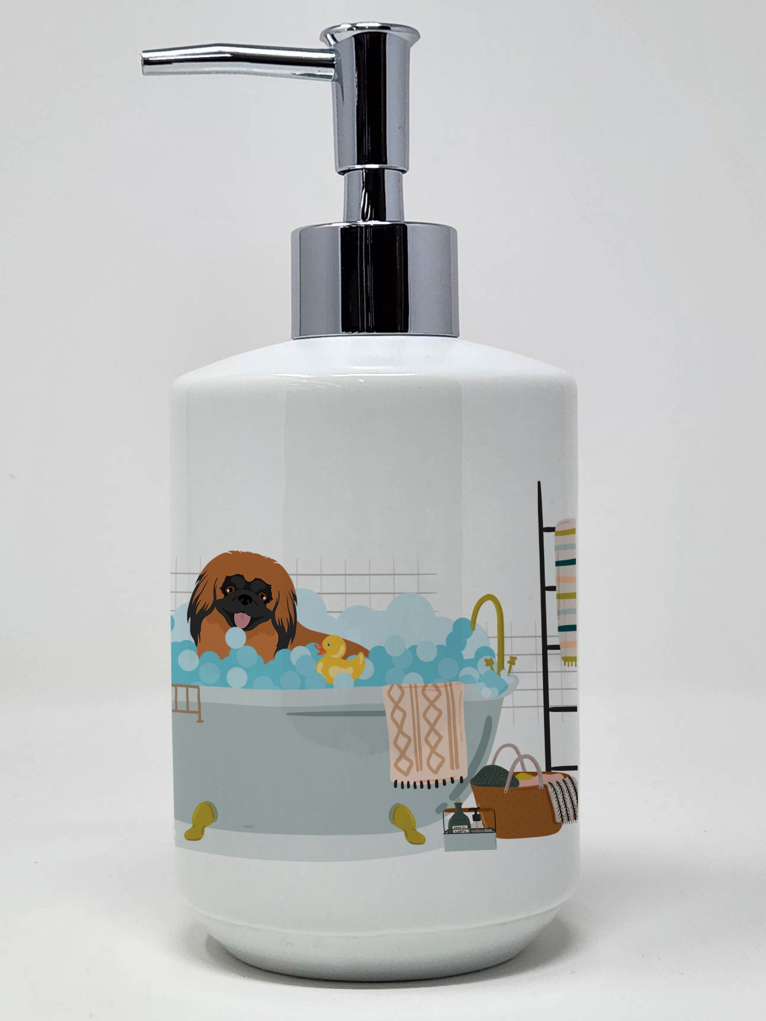 Decorate your space with our Pekingese artwork on a Ceramic Soap Dispenser. Revitalize your kitchen or bathroom decor with the Decorative Ceramic Soap Dispenser from Caroline's Treasures. This refillable dispenser marries practicality and style, serving as a vibrant art piece in addition to its primary function. The dispenser's exterior boasts colorful artwork from one of Caroline's Treasures' artists, wrapping around the dispenser to add a touch of personality and color to your space. Measuring approximately 7 1/4 inches high and about 3 1/2 inches in diameter, it is the perfect size for any countertop. The dispenser features a sturdy pump nozzle, which screws easily into the top of the ceramic dispenser. With a simple press, you can conveniently dispense your preferred liquid soap, lotion, aromatherapy essential oil blend, shampoo, body wash, or even massage oils. The Decorative Ceramic Soap Dispenser is more than a functional item - it's a statement piece that adds a unique touch to your bathroom or kitchen decor, transforming everyday rituals into an artful experience.
