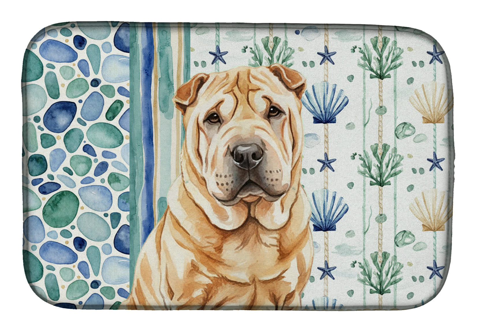 Shown here is the Red Shar Pei Coastal Sea Glass Dish Drying Mat from Caroline's Treasures featuring artwork of a Shar Pei in a Everyday design. The detailed illustration and vibrant colors make it a standout accent that celebrates both seasonal style and love for the subject. This image features a calming coastal watercolor pattern with soft seashells, seaweed, starfish, and pebble-inspired accents arranged in a repeating design. The soothing palette of blues, greens, and sandy neutrals creates a relaxed, beach-inspired look that adds a fresh and tranquil feel to any space. Everyday décor celebrates personal style and the small moments that make a house feel like home. Thoughtful designs add warmth and personality that can be enjoyed year-round. Say goodbye to messy countertops and soggy dish towels with our innovative dish drying mat. Our high-quality dish drying pad is designed to keep your countertops dry while offering a stylish and efficient solution. Whether you're air drying dishes, glasses, stemware, silverware, pots, pans, bottles, or even fruits and vegetables, our dish mat is the perfect choice. The 14 inches x 21 inches size fits most counters and dish drying racks, and the non-slip design ensures stability. Made with water-absorbent polyester and a polyurethane foam insert, our dish drying mat is not only functional but also durable. It's machine washable and printed in the USA for long-lasting use. The beautiful artwork adds flair to your kitchen decor, making it a perfect housewarming gift or present for any occasion. Upgrade your kitchen experience with our absorbent and versatile dish drying mat. Perfect for: Kitchen counters and sinks, everyday dish drying and countertop protection, Dogs-themed homes, or year-round use for Shar Pei lovers. Shar Peis are distinctive dogs known for their wrinkled skin and reserved temperament. This ancient breed is respected for its loyalty, independence, and calm demeanor. Makes a heartfelt gift for: Shar Pei owners, Dogs lovers, Everyday gifts, pet parents, friends who adore their Shar Pei, or anyone celebrating Dogs.