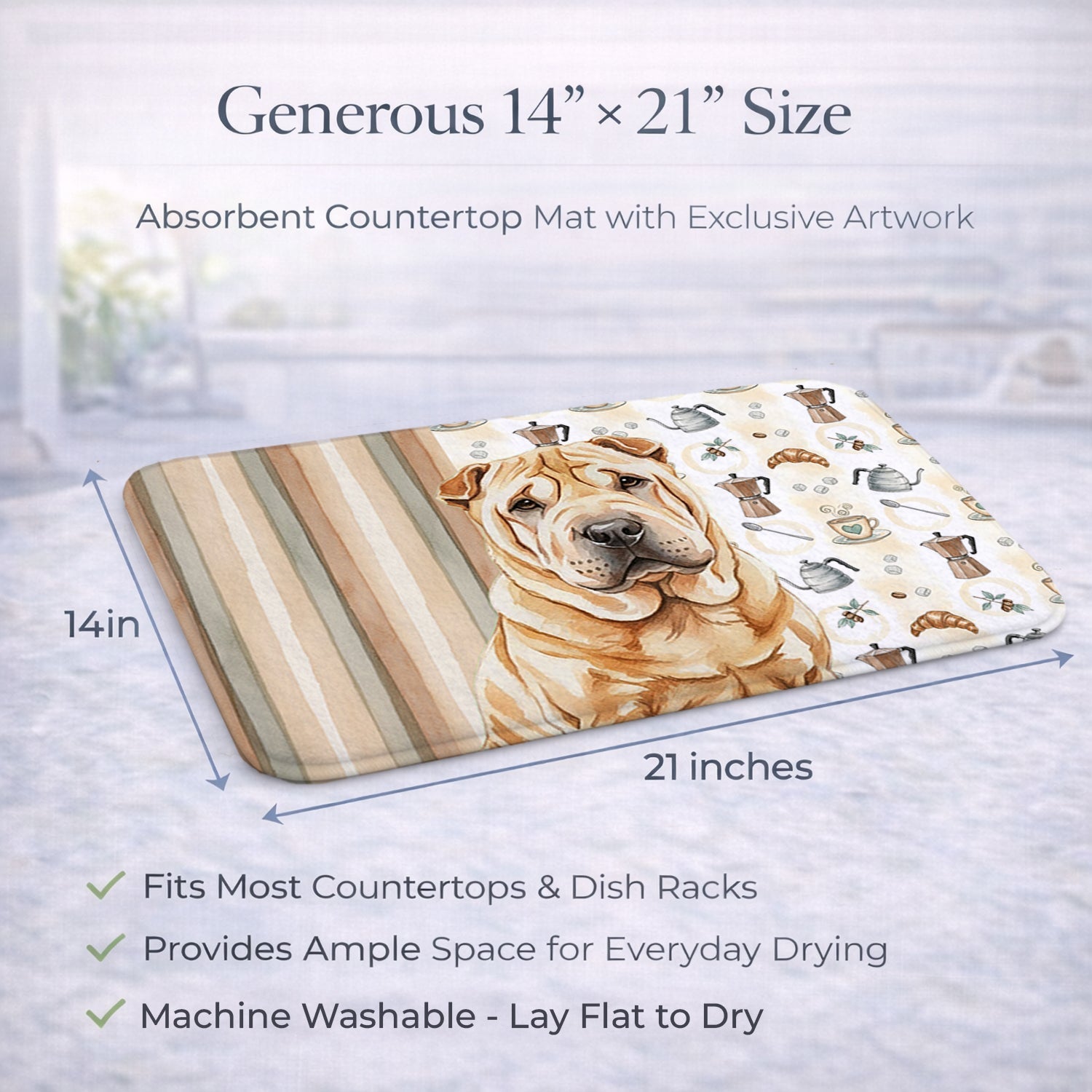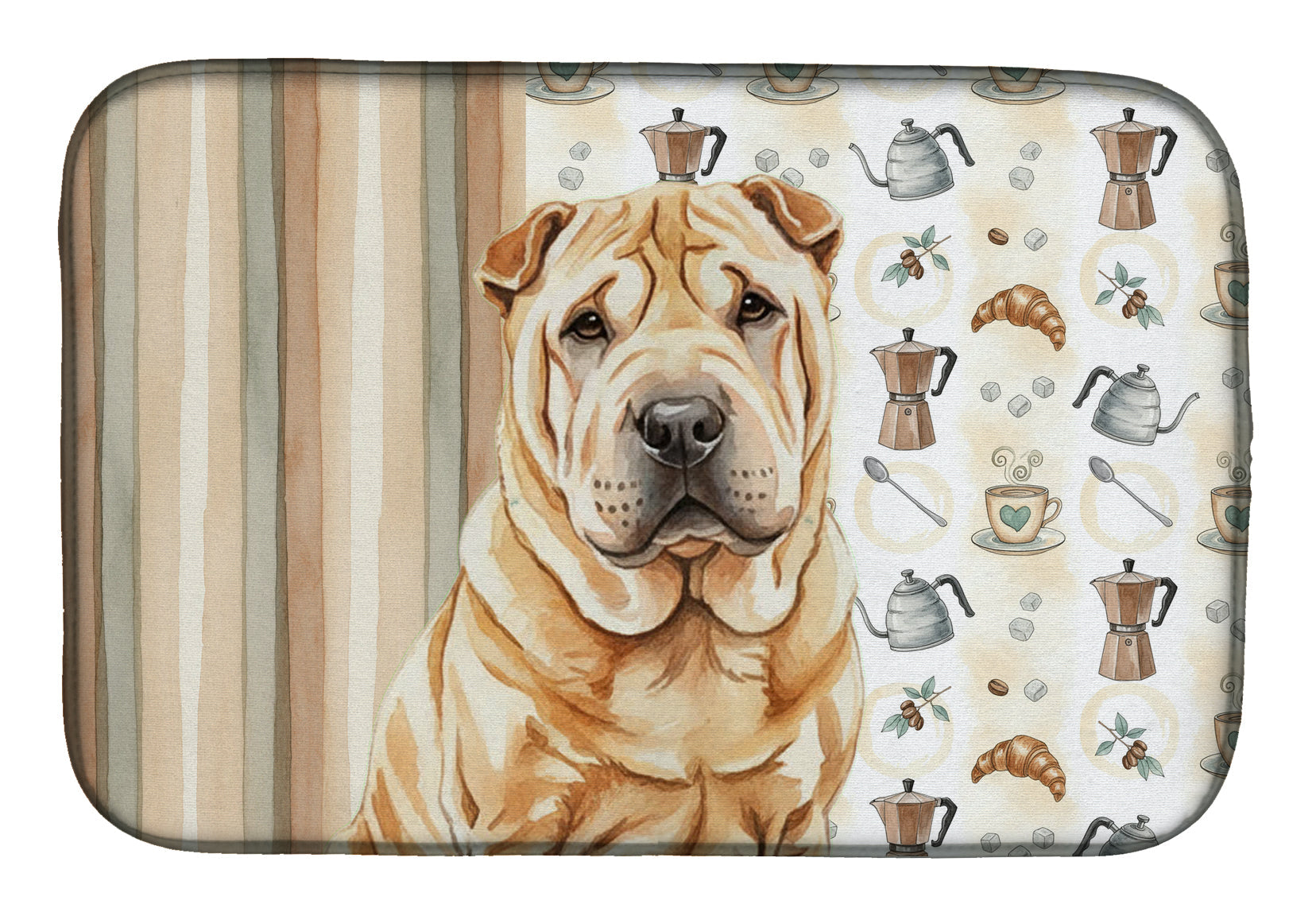 Shown here is the Red Shar Pei Coffee Bar Dish Drying Mat from Caroline's Treasures featuring artwork of a Shar Pei in a Everyday design. The detailed illustration and vibrant colors make it a standout accent that celebrates both seasonal style and love for the subject. This image features a cozy watercolor coffee-themed pattern with illustrated mugs, moka pots, kettles, croissants, coffee beans, and sugar cubes arranged in a repeating design. Soft neutral tones with warm browns, creams, and subtle sage accents create an inviting, café-inspired look that feels comforting and relaxed. Everyday décor celebrates personal style and the small moments that make a house feel like home. Thoughtful designs add warmth and personality that can be enjoyed year-round. Say goodbye to messy countertops and soggy dish towels with our innovative dish drying mat. Our high-quality dish drying pad is designed to keep your countertops dry while offering a stylish and efficient solution. Whether you're air drying dishes, glasses, stemware, silverware, pots, pans, bottles, or even fruits and vegetables, our dish mat is the perfect choice. The 14 inches x 21 inches size fits most counters and dish drying racks, and the non-slip design ensures stability. Made with water-absorbent polyester and a polyurethane foam insert, our dish drying mat is not only functional but also durable. It's machine washable and printed in the USA for long-lasting use. The beautiful artwork adds flair to your kitchen decor, making it a perfect housewarming gift or present for any occasion. Upgrade your kitchen experience with our absorbent and versatile dish drying mat. Perfect for: Kitchen counters and sinks, everyday dish drying and countertop protection, Dogs-themed homes, or year-round use for Shar Pei lovers. Shar Peis are distinctive dogs known for their wrinkled skin and reserved temperament. This ancient breed is respected for its loyalty, independence, and calm demeanor. Makes a heartfelt gift for: Shar Pei owners, Dogs lovers, Everyday gifts, pet parents, friends who adore their Shar Pei, or anyone celebrating Dogs.