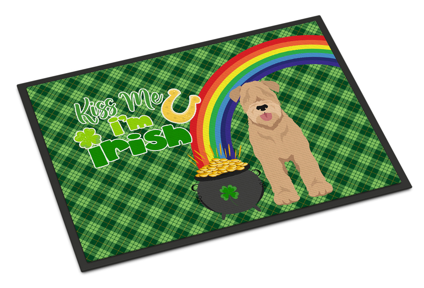 Decorate your space with our St Patrick's Day Wheaten Terrier artwork on a Doormat. Welcome your guests in style with our Artwork Door Mat, designed to withstand almost any weather condition. This mat, measuring approximately 24 by 36 inches, is held together by durable black binding tape. Its top layer, composed of polyester felt, is dyed with the eye-catching image you see on the mat. A few layers below provide the mat with stability, while its rubber bottom is stamped to help prevent slipping and ensures safety. Our mat works wonderfully as both an indoor or outdoor door mat. For cleaning, simply hose it off with water or use a power washer - no need for any cleaner that produces suds. Avoid scrubbing with a brush, instead, opt for the vacuum on floor setting. Designed manufactured and printed in the USA, this mat is a perfect addition to your porch, outdoor kitchen, entryway, or any indoor space. Its unique design makes it a charming decorative rug that greets your guests and adds a stylish touch to your home decor.