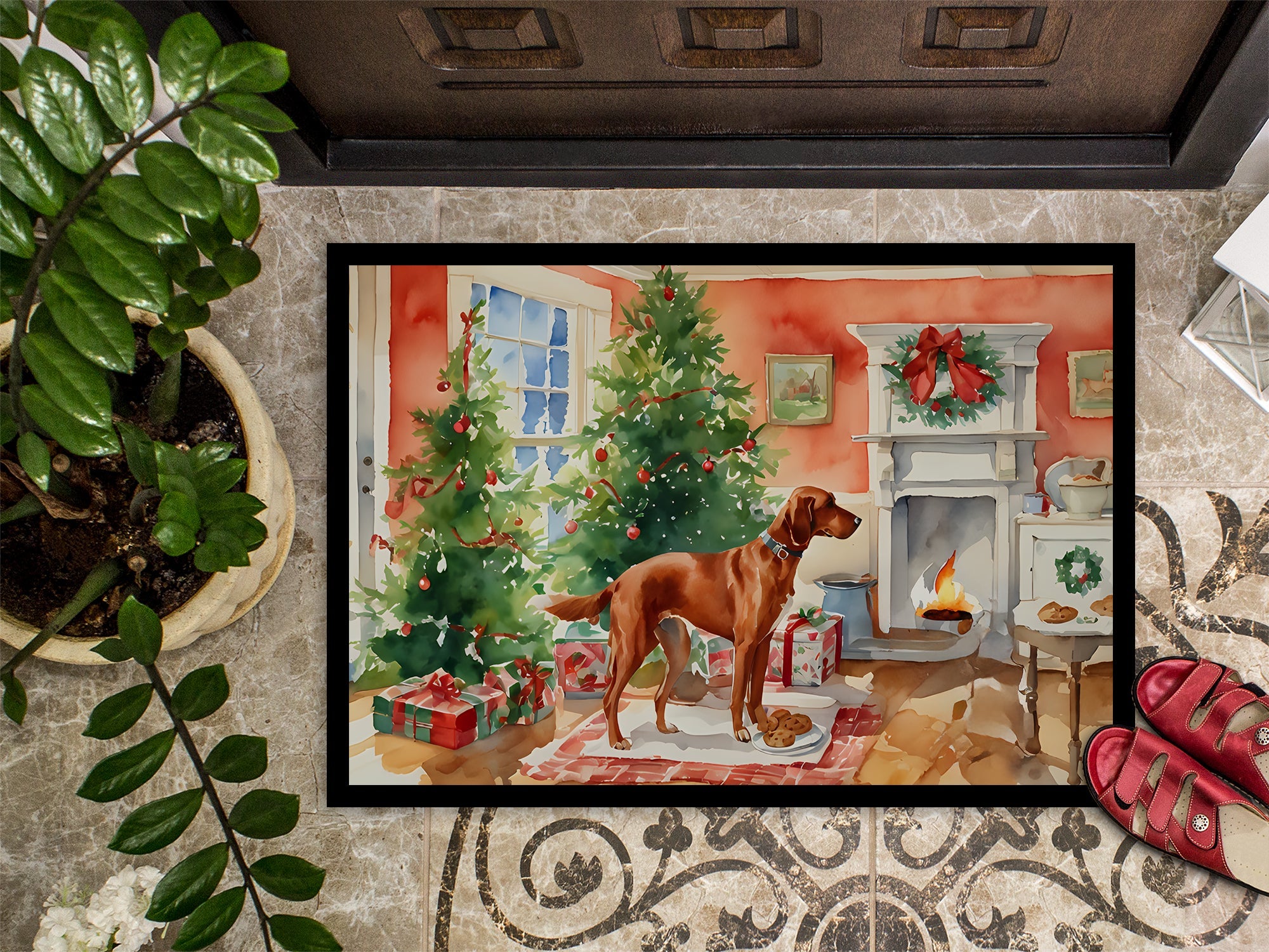 Decorate your space with our Christmas Redbone Coonhound artwork on a Doormat. Welcome your guests in style with our Artwork Door Mat, designed to withstand almost any weather condition. This mat, measuring approximately 18 by 27 inches, is held together by durable black binding tape. Its top layer, composed of polyester felt, is dyed with the eye-catching image you see on the mat. A few layers below provide the mat with stability, while its rubber bottom is stamped to help prevent slipping and ensures safety. Our mat works wonderfully as both an indoor or outdoor door mat. For cleaning, simply hose it off with water or use a power washer - no need for any cleaner that produces suds. Avoid scrubbing with a brush, instead, opt for the vacuum on floor setting. Designed manufactured and printed in the USA, this mat is a perfect addition to your porch, outdoor kitchen, entryway, or any indoor space. Its unique design makes it a charming decorative rug that greets your guests and adds a stylish touch to your home decor.