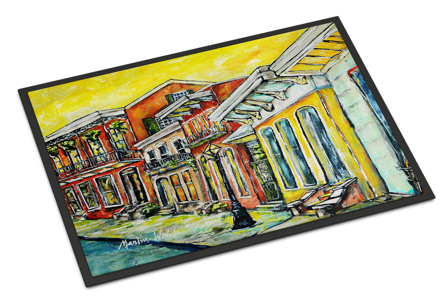Welcome your guests in style with our Artwork Door Mat, designed to withstand almost any weather condition. This mat, measuring approximately 24 by 36 inches, is held together by durable black binding tape. Its top layer, composed of polyester felt, is dyed with the eye-catching image you see on the mat. A few layers below provide the mat with stability, while its rubber bottom is stamped to help prevent slipping and ensures safety. Our mat works wonderfully as both an indoor or outdoor door mat. For cleaning, simply hose it off with water or use a power washer - no need for any cleaner that produces suds. Avoid scrubbing with a brush, instead, opt for the vacuum on floor setting. Designed manufactured and printed in the USA, this mat is a perfect addition to your porch, outdoor kitchen, entryway, or any indoor space. Its unique design makes it a charming decorative rug that greets your guests and adds a stylish touch to your home decor.