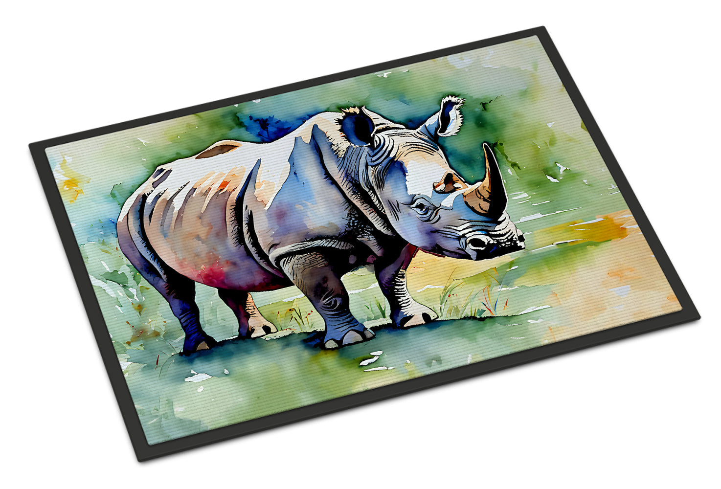 Decorate your space with our Rhinoceros artwork on a Doormat. Welcome your guests in style with our Artwork Door Mat, designed to withstand almost any weather condition. This mat, measuring approximately 24 by 36 inches, is held together by durable black binding tape. Its top layer, composed of polyester felt, is dyed with the eye-catching image you see on the mat. A few layers below provide the mat with stability, while its rubber bottom is stamped to help prevent slipping and ensures safety. Our mat works wonderfully as both an indoor or outdoor door mat. For cleaning, simply hose it off with water or use a power washer - no need for any cleaner that produces suds. Avoid scrubbing with a brush, instead, opt for the vacuum on floor setting. Designed manufactured and printed in the USA, this mat is a perfect addition to your porch, outdoor kitchen, entryway, or any indoor space. Its unique design makes it a charming decorative rug that greets your guests and adds a stylish touch to your home decor.