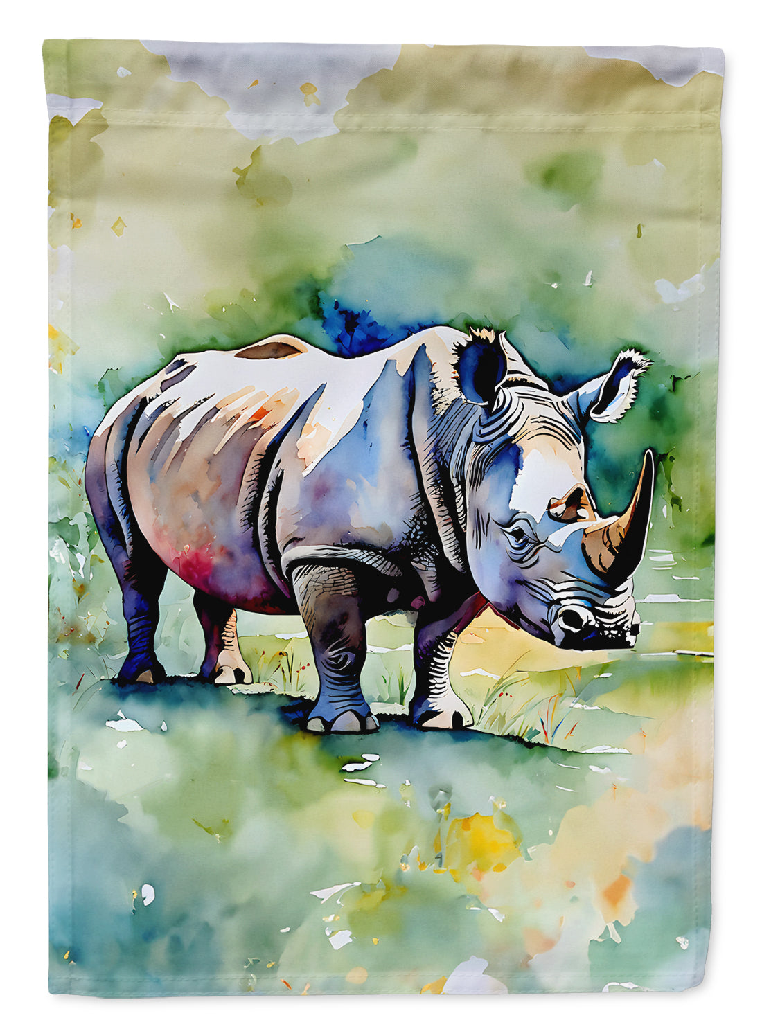 Decorate your space with our Rhinoceros artwork on a Garden Flag. Enhance the beauty of your garden, patio, or yard with Caroline's Treasures Decorative Garden Flag, proudly made in the USA. Crafted from two pieces of thick, double-sided polyester fabric, this 2-ply garden flag is designed to withstand various weather conditions, making it water-resistant and weatherproof. Featuring correctly readable words on both sides, this garden flag offers a delightful visual experience from any angle. With its heavier weight, it stands out among other garden flags, ensuring stability and durability even in wind, rain, and snow. Measuring approximately 11 1/4 inches by 15 1/2 inches, this flag allows you to personalize your outdoor decor. It comes with a 1 1/2-inch sleeve sewn in, allowing easy attachment to any standard garden flag stand or garden size porch hanger (sold separately). Make a statement in your outdoor space with Caroline's Treasures Decorative Garden Flag, a vibrant and high-quality flag that adds color and personality to your surroundings. Proudly made in the USA, it's a symbol of quality craftsmanship and attention to detail.