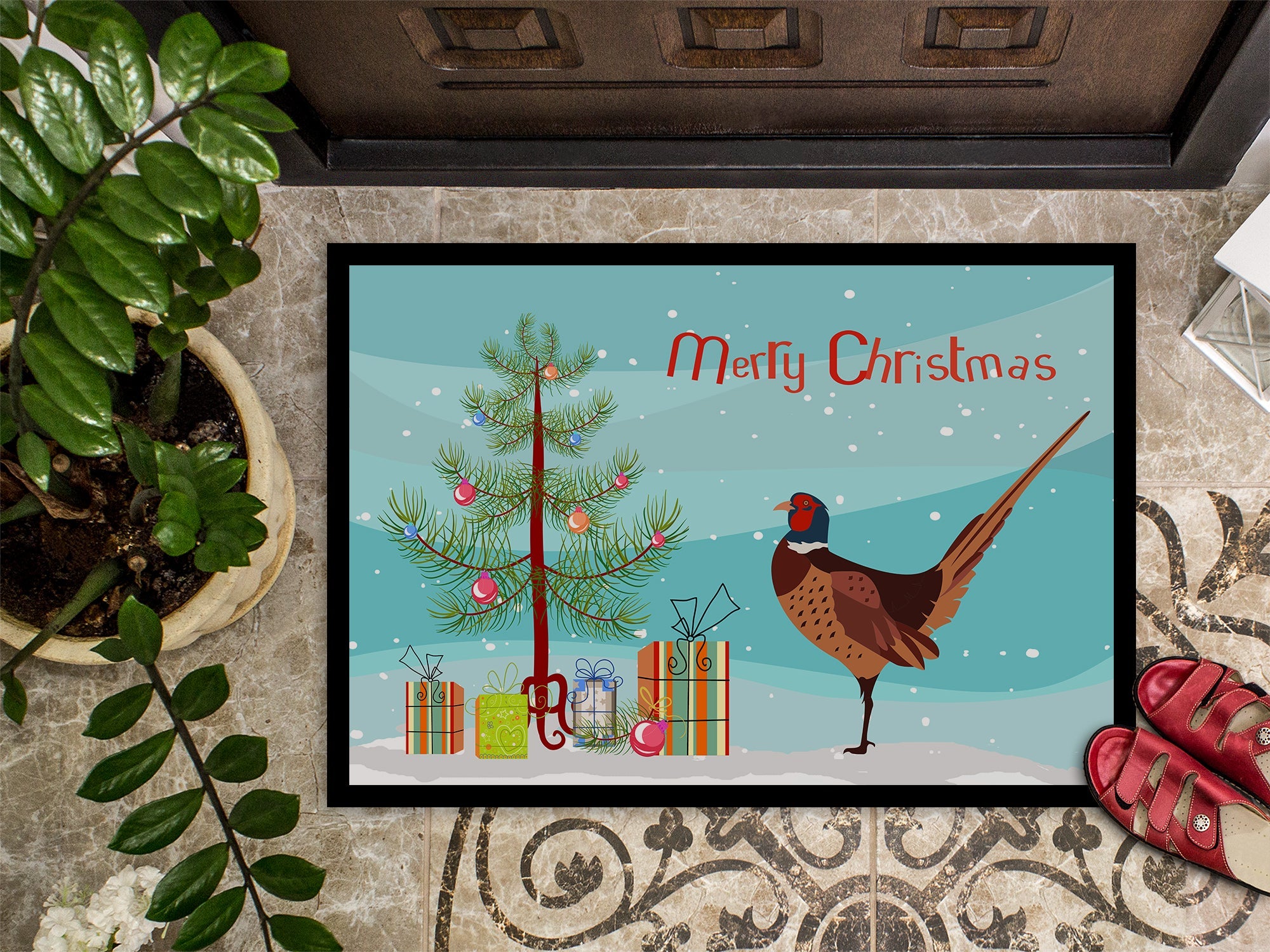 Decorate your space with our Christmas Ring-necked Common Pheasant artwork on a Doormat. Welcome your guests in style with our Artwork Door Mat, designed to withstand almost any weather condition. This mat, measuring approximately 18 by 27 inches, is held together by durable black binding tape. Its top layer, composed of polyester felt, is dyed with the eye-catching image you see on the mat. A few layers below provide the mat with stability, while its rubber bottom is stamped to help prevent slipping and ensures safety. Our mat works wonderfully as both an indoor or outdoor door mat. For cleaning, simply hose it off with water or use a power washer - no need for any cleaner that produces suds. Avoid scrubbing with a brush, instead, opt for the vacuum on floor setting. Designed manufactured and printed in the USA, this mat is a perfect addition to your porch, outdoor kitchen, entryway, or any indoor space. Its unique design makes it a charming decorative rug that greets your guests and adds a stylish touch to your home decor.