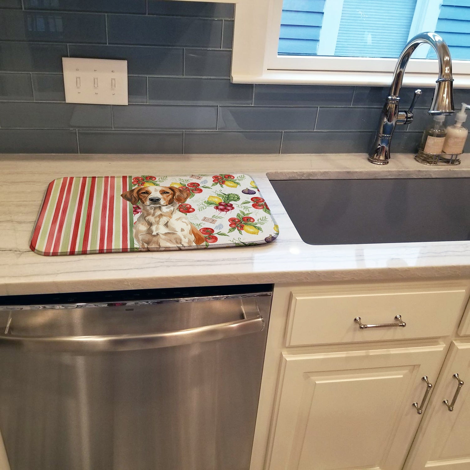 Shown here is the Roan Brittany Vegetables Dish Drying Mat from Caroline's Treasures featuring artwork of a Brittany in a Everyday design. The detailed illustration and vibrant colors make it a standout accent that celebrates both seasonal style and love for the subject. This image features a vibrant watercolor vegetable pattern with tomatoes, lemons, artichokes, figs, radishes, and leafy greens arranged in a repeating design, paired with classic red and green stripes. The bright, garden-fresh palette creates a cheerful, farmhouse-inspired look that feels lively, welcoming, and perfect for kitchen décor. Everyday décor celebrates personal style and the small moments that make a house feel like home. Thoughtful designs add warmth and personality that can be enjoyed year-round. Say goodbye to messy countertops and soggy dish towels with our innovative dish drying mat. Our high-quality dish drying pad is designed to keep your countertops dry while offering a stylish and efficient solution. Whether you're air drying dishes, glasses, stemware, silverware, pots, pans, bottles, or even fruits and vegetables, our dish mat is the perfect choice. The 14 inches x 21 inches size fits most counters and dish drying racks, and the non-slip design ensures stability. Made with water-absorbent polyester and a polyurethane foam insert, our dish drying mat is not only functional but also durable. It's machine washable and printed in the USA for long-lasting use. The beautiful artwork adds flair to your kitchen decor, making it a perfect housewarming gift or present for any occasion. Upgrade your kitchen experience with our absorbent and versatile dish drying mat. Perfect for: Kitchen counters and sinks, everyday dish drying and countertop protection, Dogs-themed homes, or year-round use for Brittany lovers. Brittanys, also known as Brittany Spaniels, are energetic sporting dogs known for their agility and intelligence. This breed is admired for its friendly disposition and strong hunting instincts. Makes a heartfelt gift for: Brittany owners, Dogs lovers, Everyday gifts, pet parents, friends who adore their Brittany, or anyone celebrating Dogs.